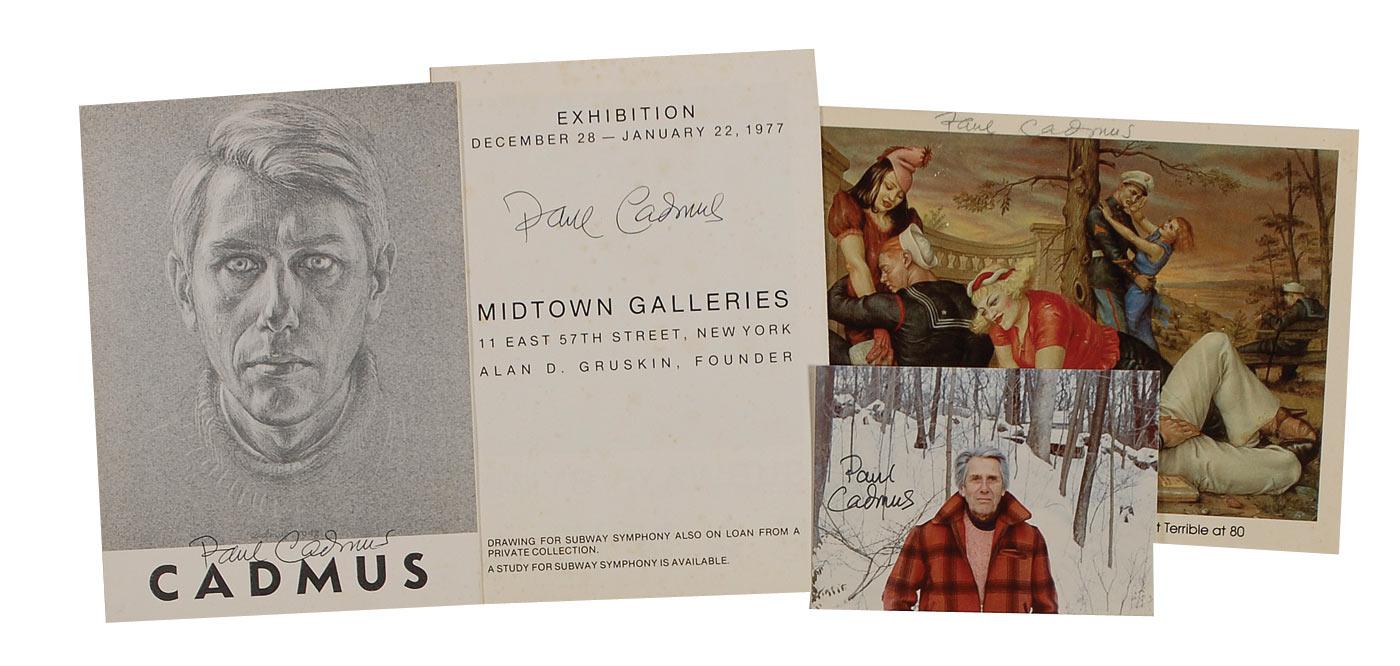 Three exhibition notices, ranging in size from 5.5 x 7.75 to 9 x 6 and each signed “Paul Cadmus”; and a color candid 5 x 3.5 photo of Cadmus in the snow-covered outdoors signed in black felt tip. In overall very good to fine condition.