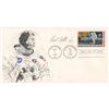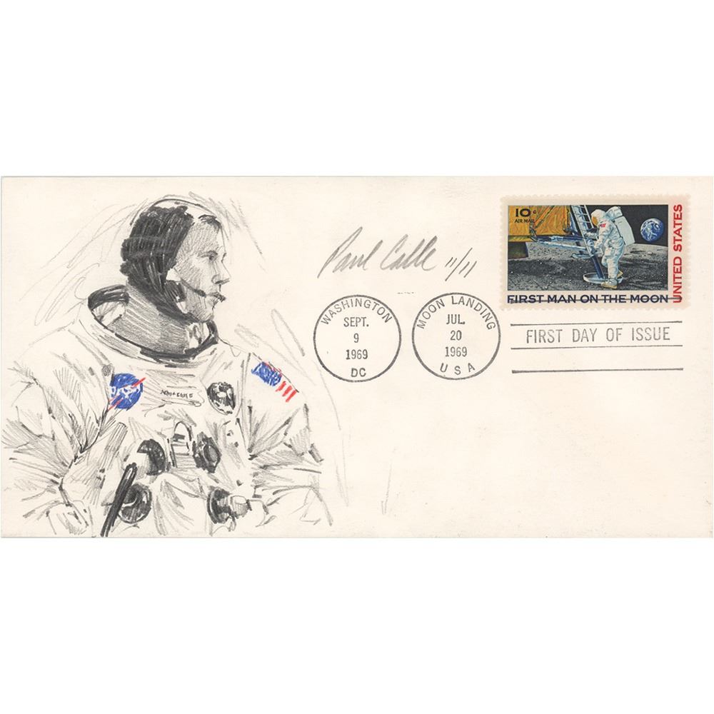 Limited edition FDC, 7.5 x 4, numbered 11/11, signed in pencil by artist Paul Calle, who has added a wonderful graphite and colored pencil sketch of Neil Armstrong wearing his white space suit. The cover is postmarked July 20, 1969, the date of the Apollo 11 moon landing, and September 9, 1969, the issue date for the jumbo-sized commemorative "First Man on the Moon" stamp, which is affixed to the right corner. In very fine condition.