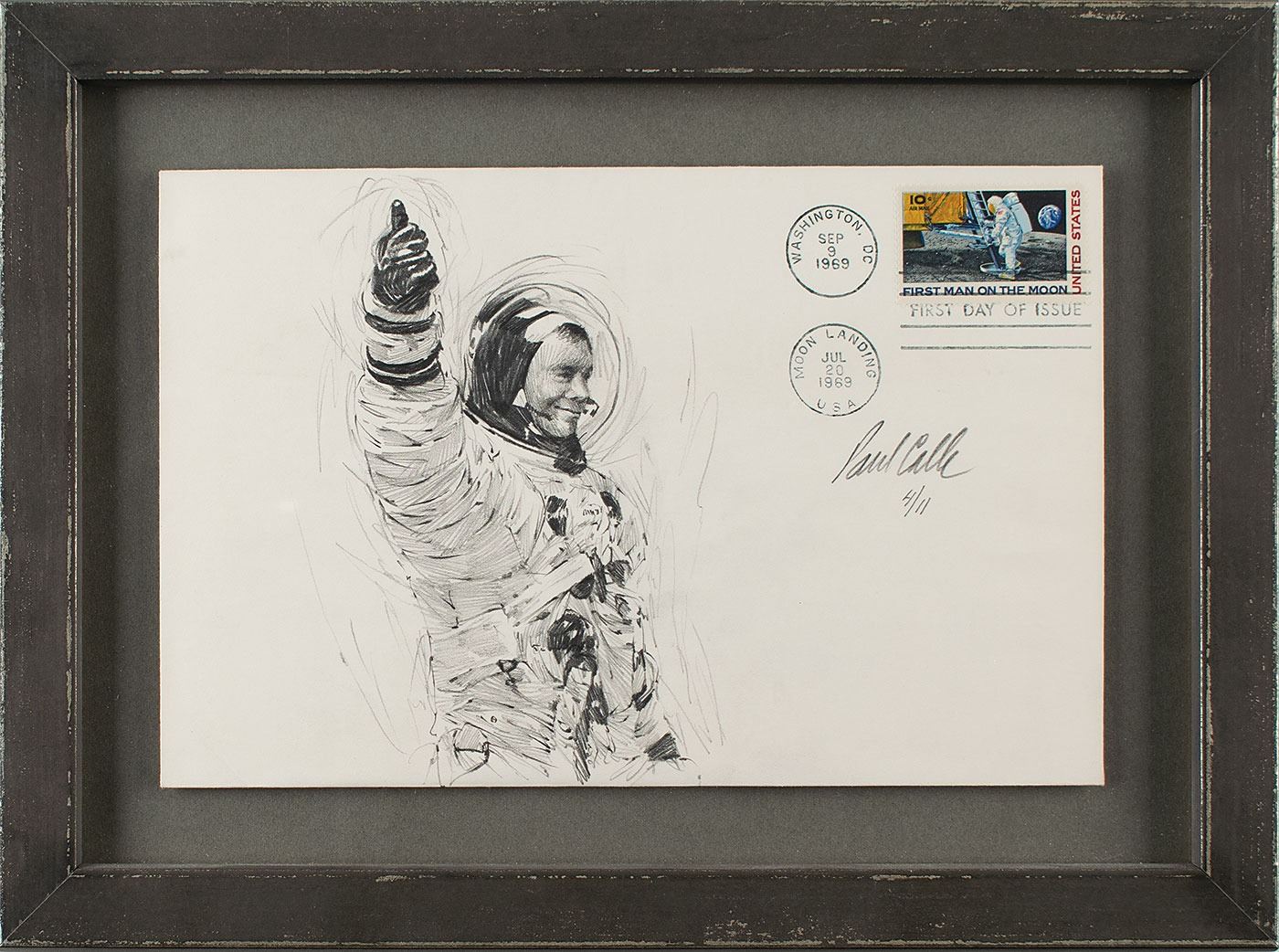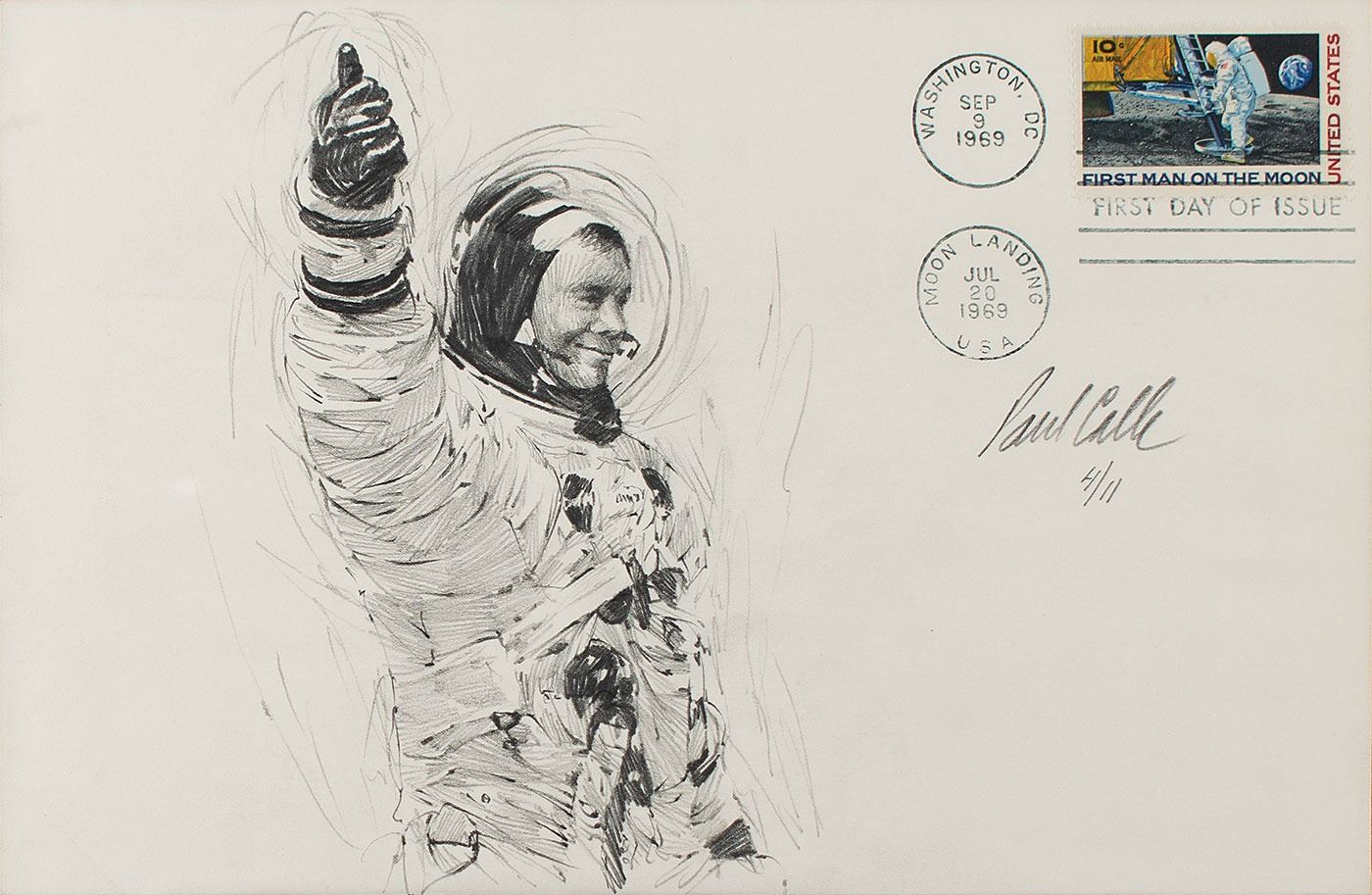 Fantastic original limited edition large sketch of Neil Armstrong in his white space suit giving a thumbs up by renowned space artist Paul Calle, numbered 4/11, accomplished in graphite on an oversized 9.5 x 6.25 First Day Cover. Postmarked July 20, 1969, the date of the Apollo 11 moon landing, and September 9, 1969, the issue date for the jumbo-sized commemorative "First Man on the Moon" stamp. Signed below the stamp in pencil, "Paul Calle." Mounted and framed to an overall size of 13 x 9.5. In fine condition.