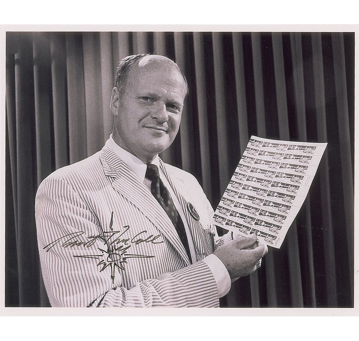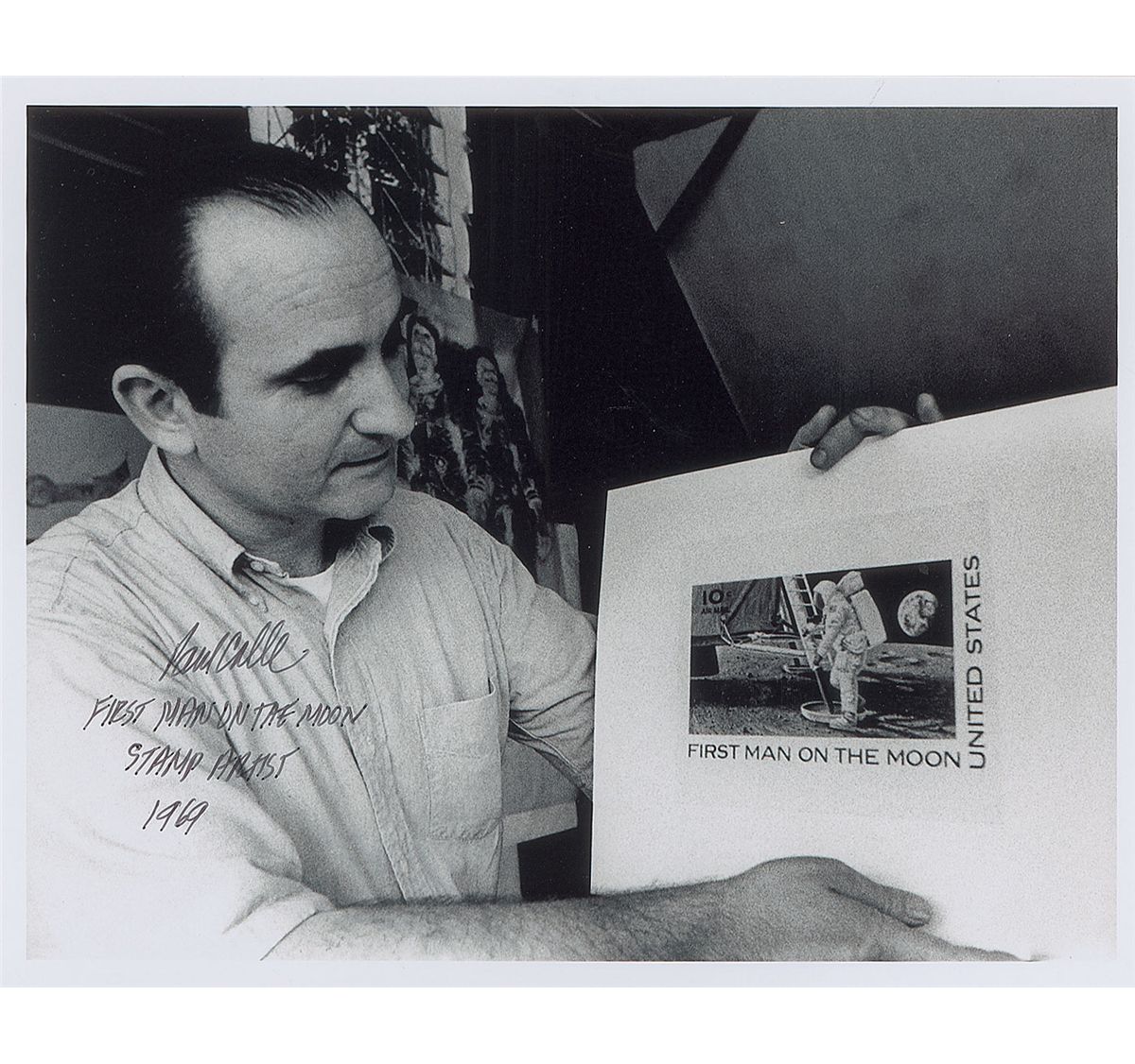 Two satin-finish 10 x 8 photos: one of Calle holding a design of his first man on the moon stamp, signed in black felt tip, “Paul Calle, first man on the moon stamp artist 1969”; and one of McCall holding a sheet of his stamps, signed in black felt tip, adding a star sketch under his signature. In very fine condition.