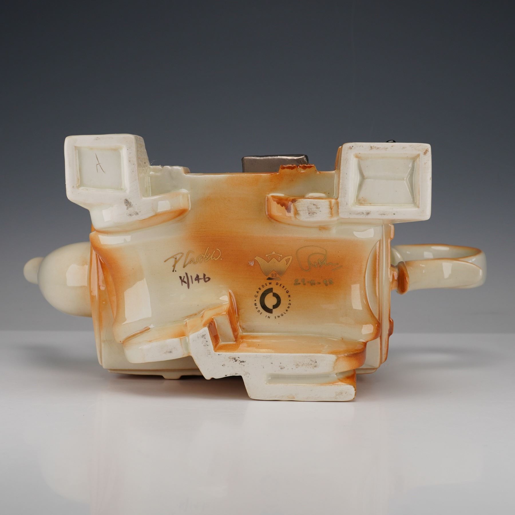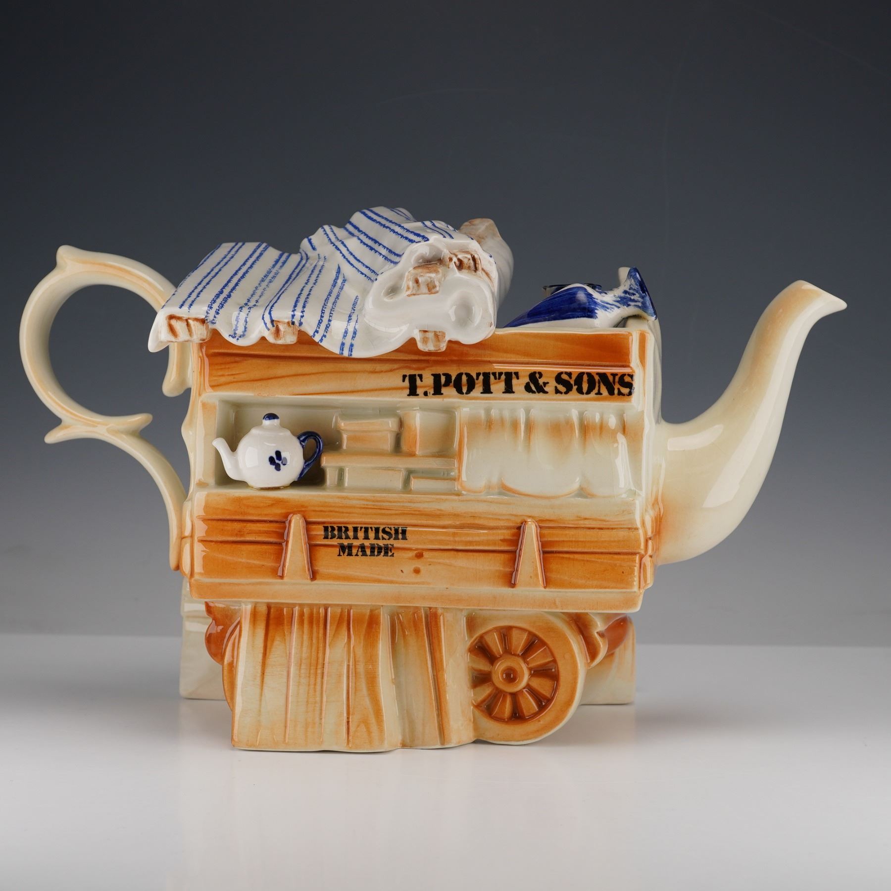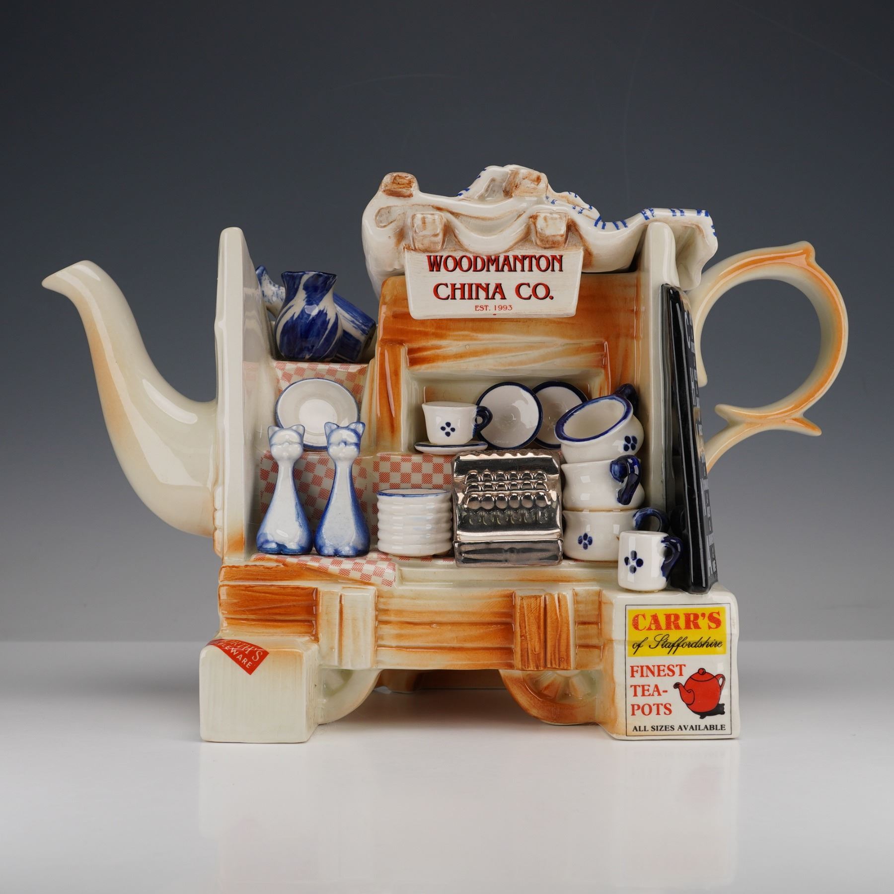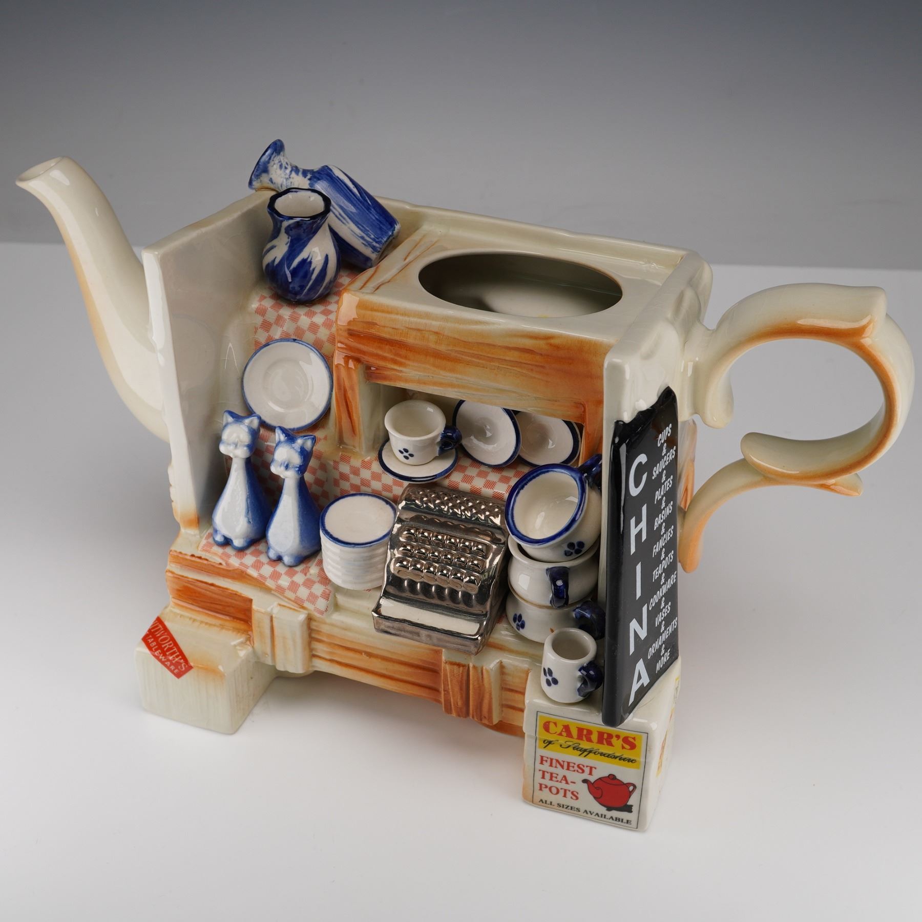 A finely modeled teapot formed as a nostalgic storefront vignette depicting the "Woodmanton China Co.," complete with miniature shelves displaying blue and white ceramics, a vintage cashier, and stacks of china wares. The reverse side features the inscription "T. Pott & Sons" and "British Made," with additional sculptural details. Paul Cardew, Cardew Designs backstamp.