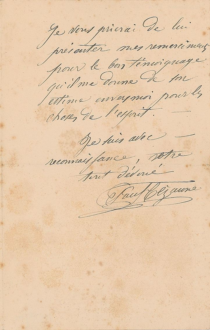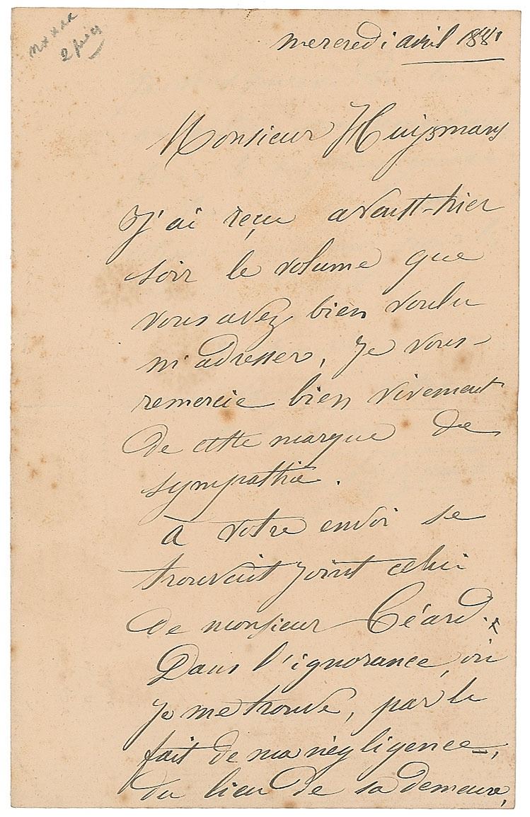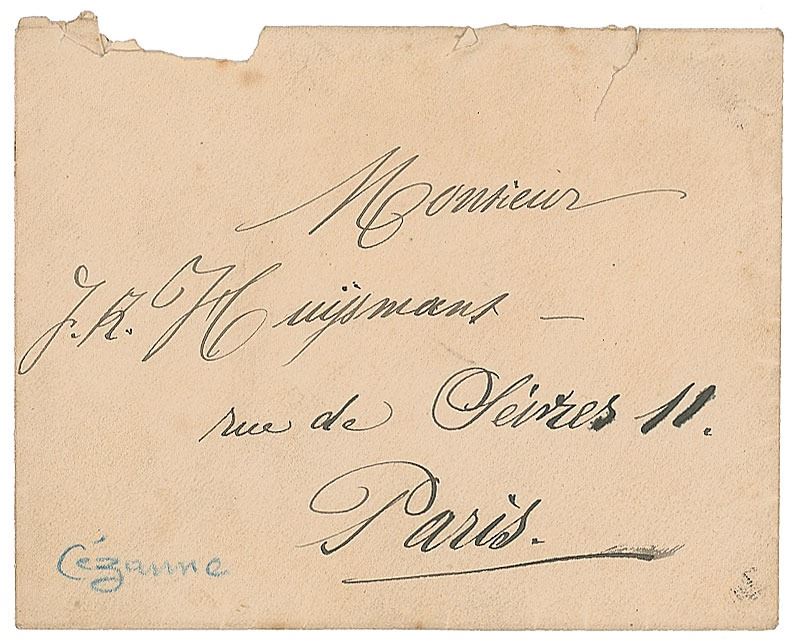 Rare ALS in French, two pages on two adjoining sheets, 4.5 x 7, April 1881. Letter to novelist Joris-Karl Huysmans, in full (translated): "I received the day before yesterday the book you were kind enough to send me. My hearty thanks for that kind thought. Along with your gift, I found one from Monsieur Ceard. Since I carelessly failed to note his address, I must ask you to give him my thanks for the token of his esteem for my qualities of mind." In very good to fine condition, with scattered light foxing and staining. Accompanied by the original transmittal envelope, addressed in Cezanne's hand. Huysmans had published his third novel, En Menage, in February 1881; Henry Ceard was his friend and a fellow writer, best remembered for his 1881 naturalistic novel, Un Belle Journee. An important piece associating the worlds of art and literature in 19th century France, and the first Cezanne letter we have offered in nine years.
