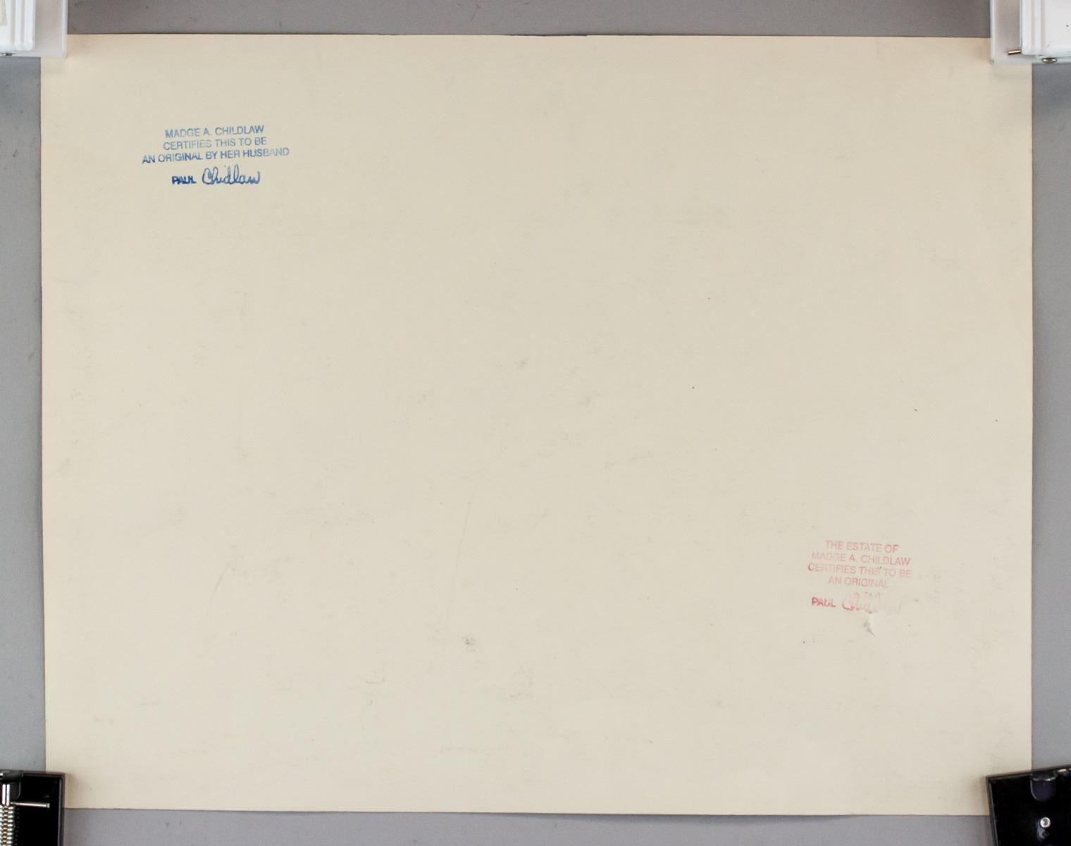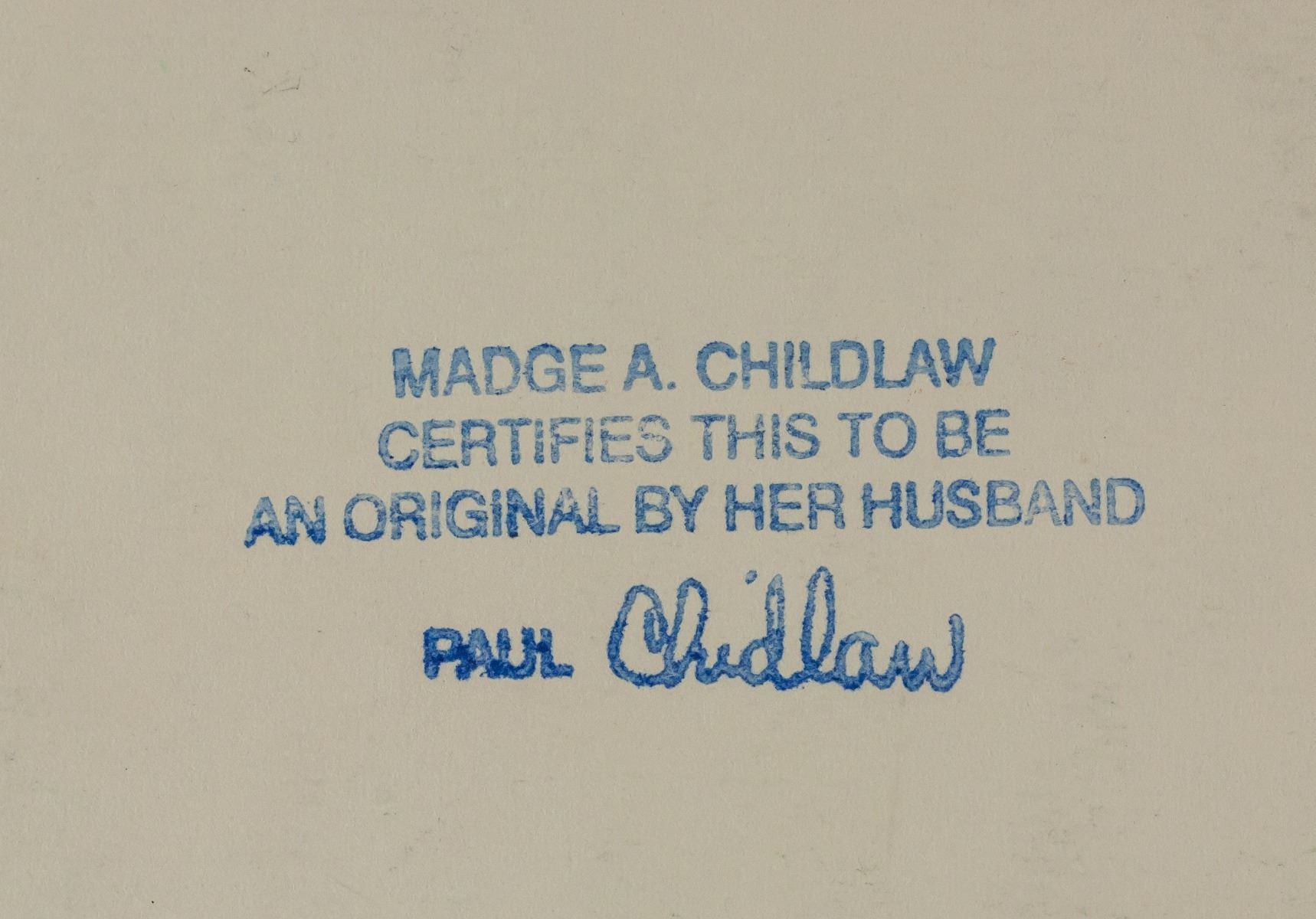 Mixed media on paper. Featuring a landscape scene. Stamped inscribed on verso MADGE A. CHILDLAW CERTIFIES THIS TO BE AN ORIGINAL BY HER HUSBAND PAUL CHIDLAW. Another stamp inscribed THE ESTATE OF MADGE A. CHILDLAW CERTIFIES THIS TO BE AN ORIGINAL PAUL Childlaw. Attributed to Paul Childlaw (1900-1989, American). 27 x 35 cm (10.75 x 13.75 inches). PROVENANCE: This lot carries limited provenance from a Private American collection (Los Angeles, CA)