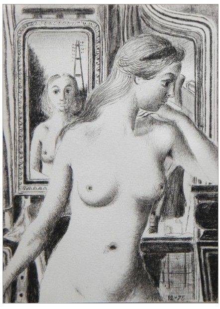 Paul Delvaux Original Lithograph "La Reflection" - Medium: Original Lithograph. Executed in 1975 and printed in Paris by Mourlot. Published as the frontispiece of the Mira Jacob catalogue raisonné of Paul Delvaux engraved works. Sheet size: 12 1/2 x 9 1/4 inches (320 x 237mm) - Professionally Framed & Matted - Comes With Certificate - -