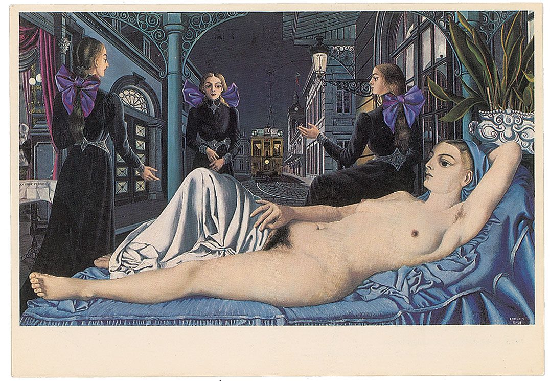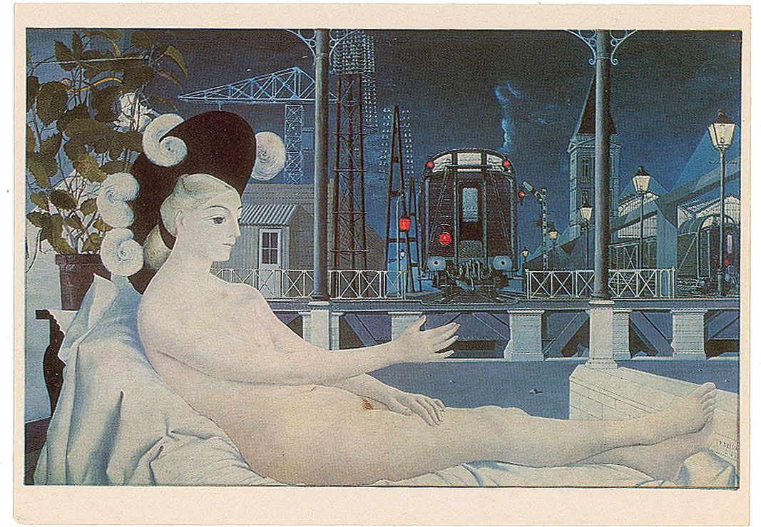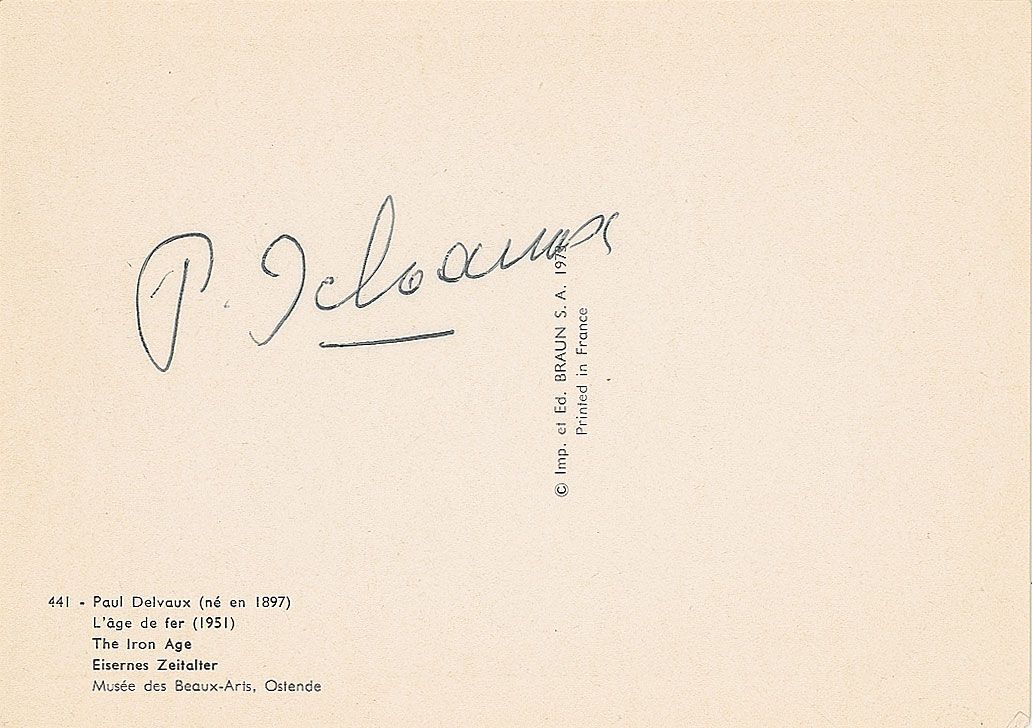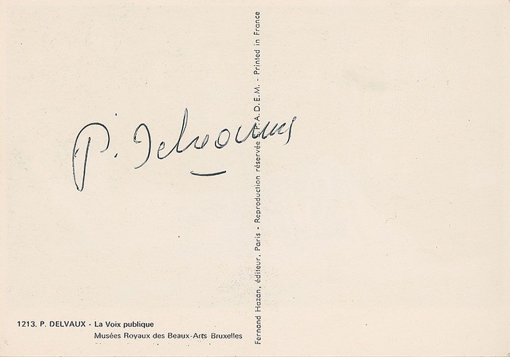 Two color postcards of Delvaux’s nudes entitled ‘Le Voix Publique’ and ‘L’age de Fer,’ both 6 x 4, each signed on the reverse in black ballpoint, “P. Delvaux.” In overall fine condition, with trivial corner tip dings.