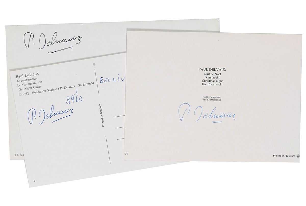 Three different color postcards of Delvaux’s works, ranging in size from 5.75 x 4 to 7.5 x 4.75, each signed on the reverse in felt tip or ballpoint. In overall fine condition.