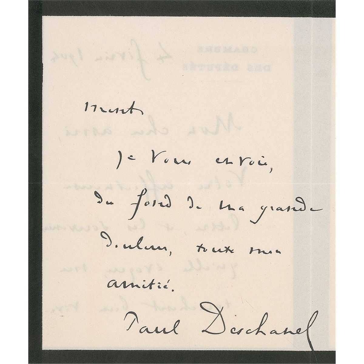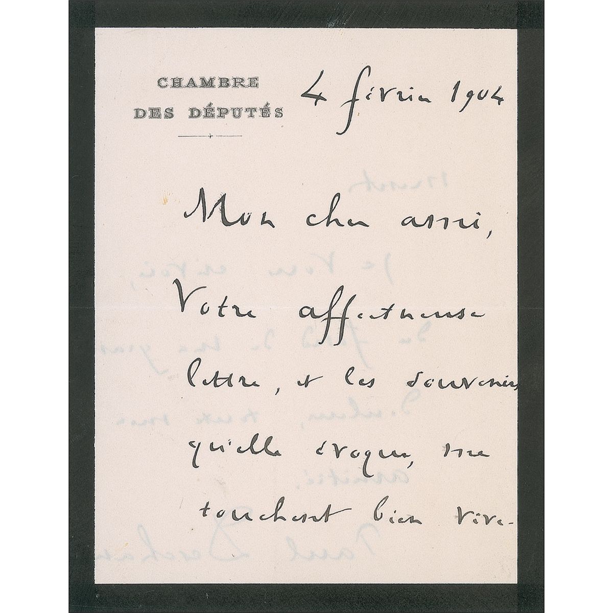 French statesman who served as President of France from February to September 1920. ALS, one page both sides, 4 x 5.25, black-bordered Chambre des Deputes letterhead, February 4, 1904. Untranslated letter to a friend. In fine condition, with central horizontal fold and end of signature extending over hinge to second integral page.