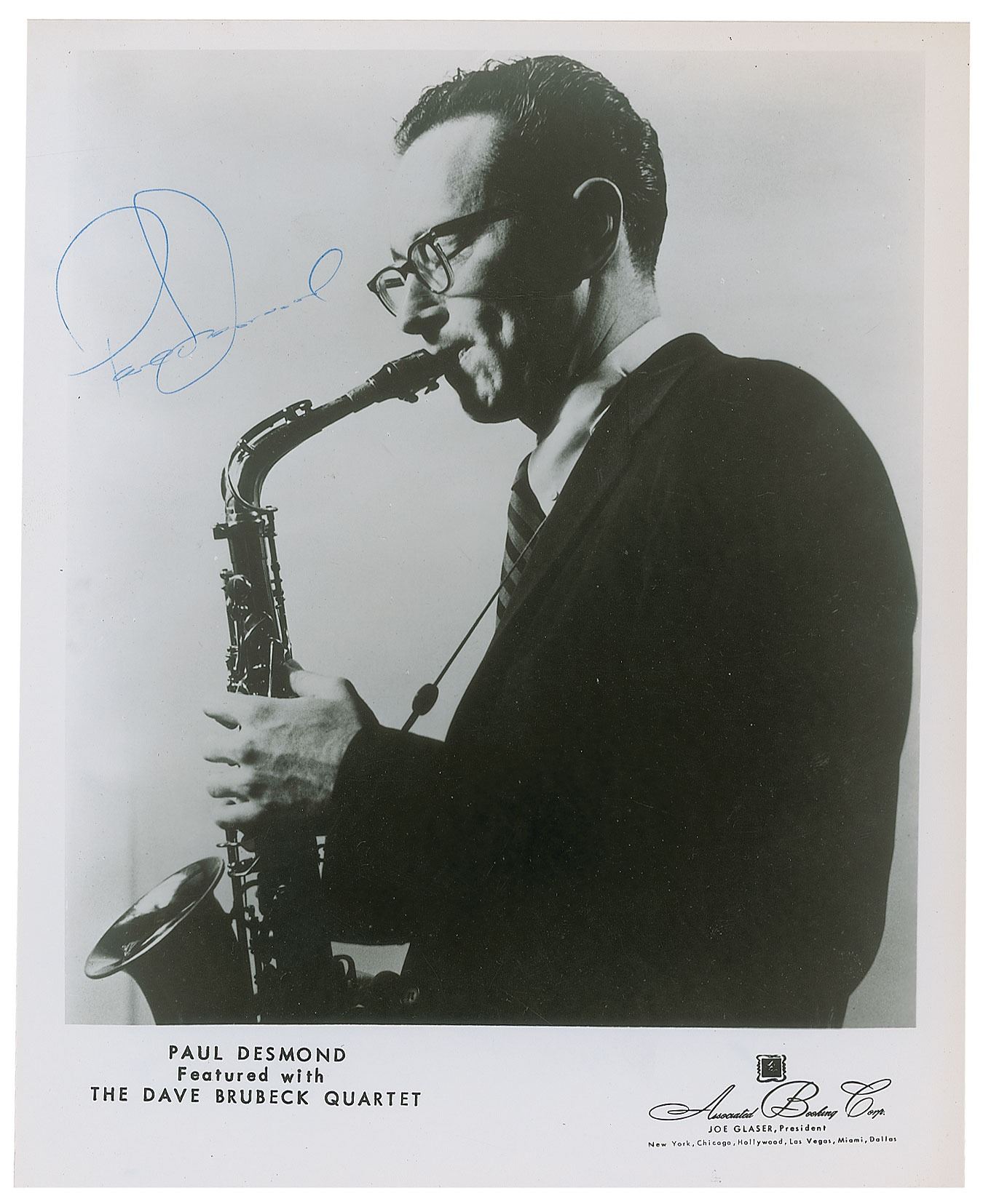 Vintage glossy 8 x 10 publicity photo of Desmond as the saxophonist for the Dave Brubeck Quartet, signed and inscribed in blue ballpoint. In fine condition.