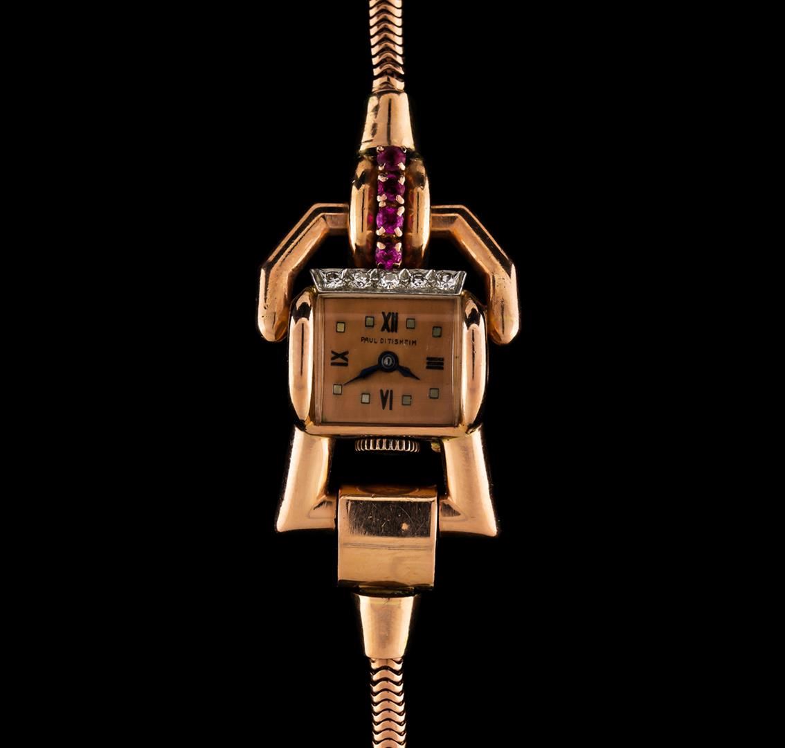 One ladies, vintage Solvil Paul Ditisheim stylized Art Deco period design wristwatch electronically tested 14KT Rose gold, Case: 17mm x 14mm, Case Back: space available for engraving, Flexible Case Lugs: set with rubies and diamonds, Crown: scalloped edge, Bezel: polished, Crystal: acrylic. Solvil Paul Ditisheim Movement: seventeen jewel unadjusted mechanical stem wind, Dial: Rose color, Blue steel pointed hands, numerals, and indices, 14KT Rose gold Bracelet: flexible, Condition: G- 5 Fine. Six inch length. Containing: Five bead set single cut diamonds, measuring 1.60 - 1.50 x 0.93mm (depth est.) approximate total weight of 5 Stones = 0.08ct. Clarity: VS-2 to SI-1. Color: H - J Four prong set round mixed cut natural rubies, measuring 2.60 - 2.50 x 1.66 mm, approximate total weight of 0.40ct., clarity is moderately included, type II, medium, very slightly brownish, slightly purplish red color, (GIA slpR 5/3), cut is good. Total Weight of Colored Stones 0.40ct. Total Weight of Diamonds 0.08ct. Total Weight of Watch 25.64gm. AIG Appraised at $4,450.00.