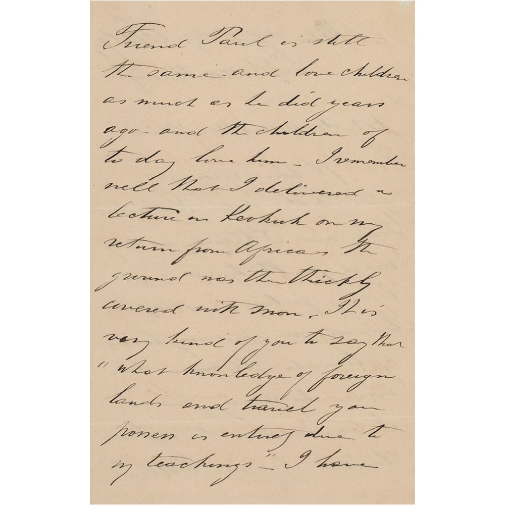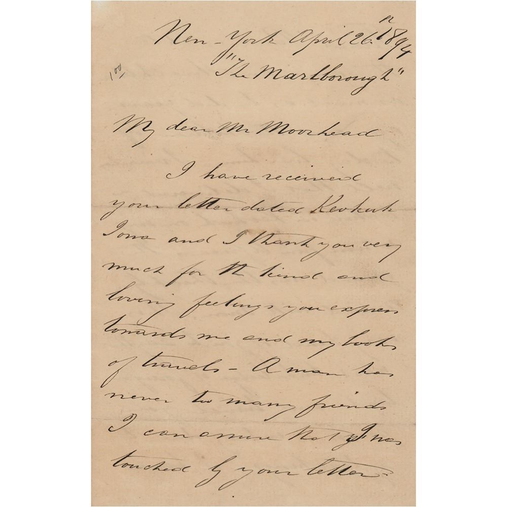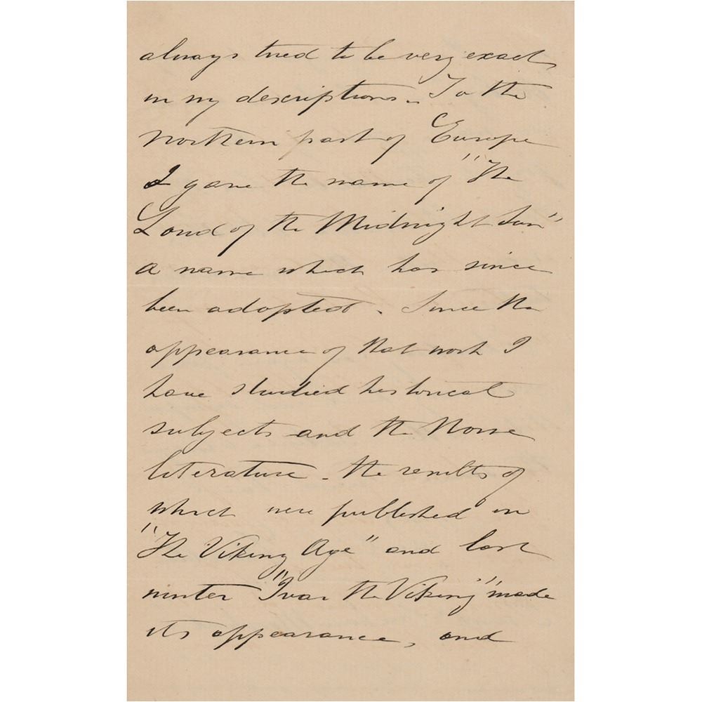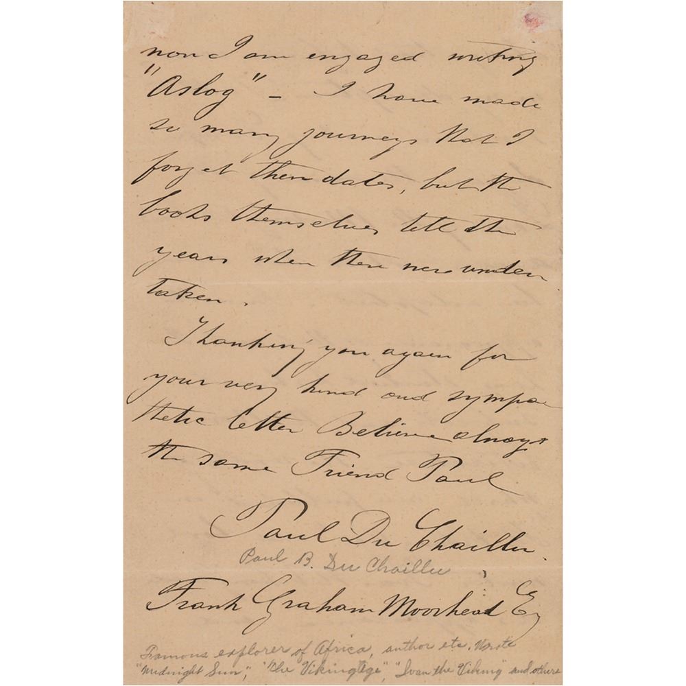 ALS, four pages on two adjoining sheets, 4.5 x 6.75, April 26, 1894. Handwritten letter to an admirer, in part: "I thank you very much for the kind and loving feelings you express towards me and my books of travelsI remember well that I delivered a lecture in Keokuk on my return from Africa. The ground was then thickly covered with snow. It is very kind of you to say that 'what knowledge of foreign lands and travel you possess is entirely due to my teachings.' I have always tried to be very exact in my descriptions. To the northern part of Europe I gave the name of 'The Land of the Midnight Sun' a name which has since been adopted. Since the appearance of that work I have studied historical subjects and the Norse literature, the results of which were published in 'The Viking Age' and last winter 'Ivan the Viking' made its appearance." In fine condition.