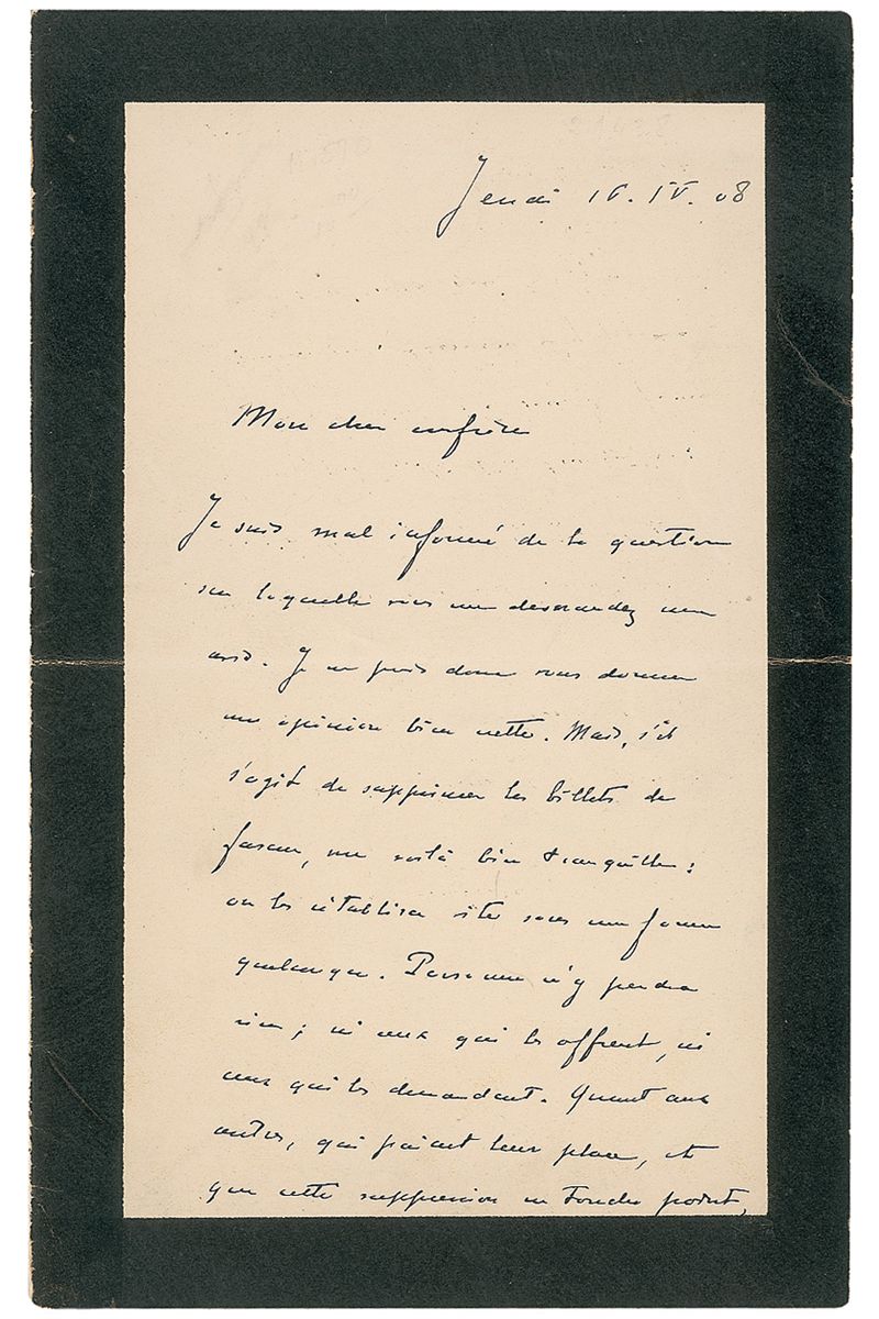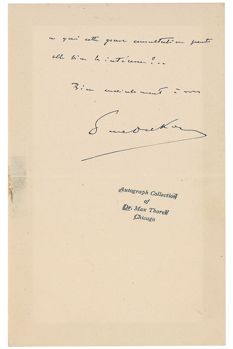 French composer (1865–1935) best known for ‘The Sorcerer’s Apprentice,’ interpreted to delightful effect in Disney’s Fantasia. ALS in French, two pages on two adjoining sheets, 4.5 x 7, black-bordered stationery, April 16, 1908. Letter to a colleague. In full (translated): “I am ill-informed on the question about which you have asked my advice. Therefore, I can only give you my very limited opinion. If it comes down to being a question of putting an end to orders for [complimentary theatre] tickets, you should just calmly but quickly establish a ruling. No one will lose anything by it: neither those who ask for them, nor those who offer them. As to the others, who pay for their seats and are not affected by this suppression, whom can this grave consultation interest?” In very good condition, with a central horizontal fold, mild scattered creases, small tape repair to reverse of second integral page, light erased pencil notation to upper right, and ownership stamp of renowned surgeon and collector Dr. Max Thorek below the signature. Accompanied by a small unsigned book photo of Dukas.