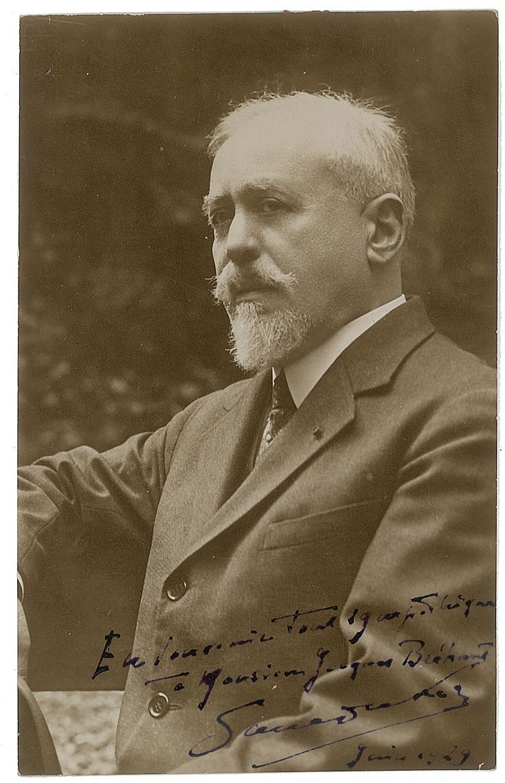 French composer (1865–1935) best known for 'The Sorcerer's Apprentice,' interpreted to delightful effect in Disney's Fantasia. Uncommon matte-finish 3.25 x 5.25 postcard photo of Dukas, signed and inscribed in fountain pen in French, and dated 1929. In fine condition, with light rippling from old mounting residue on the reverse.