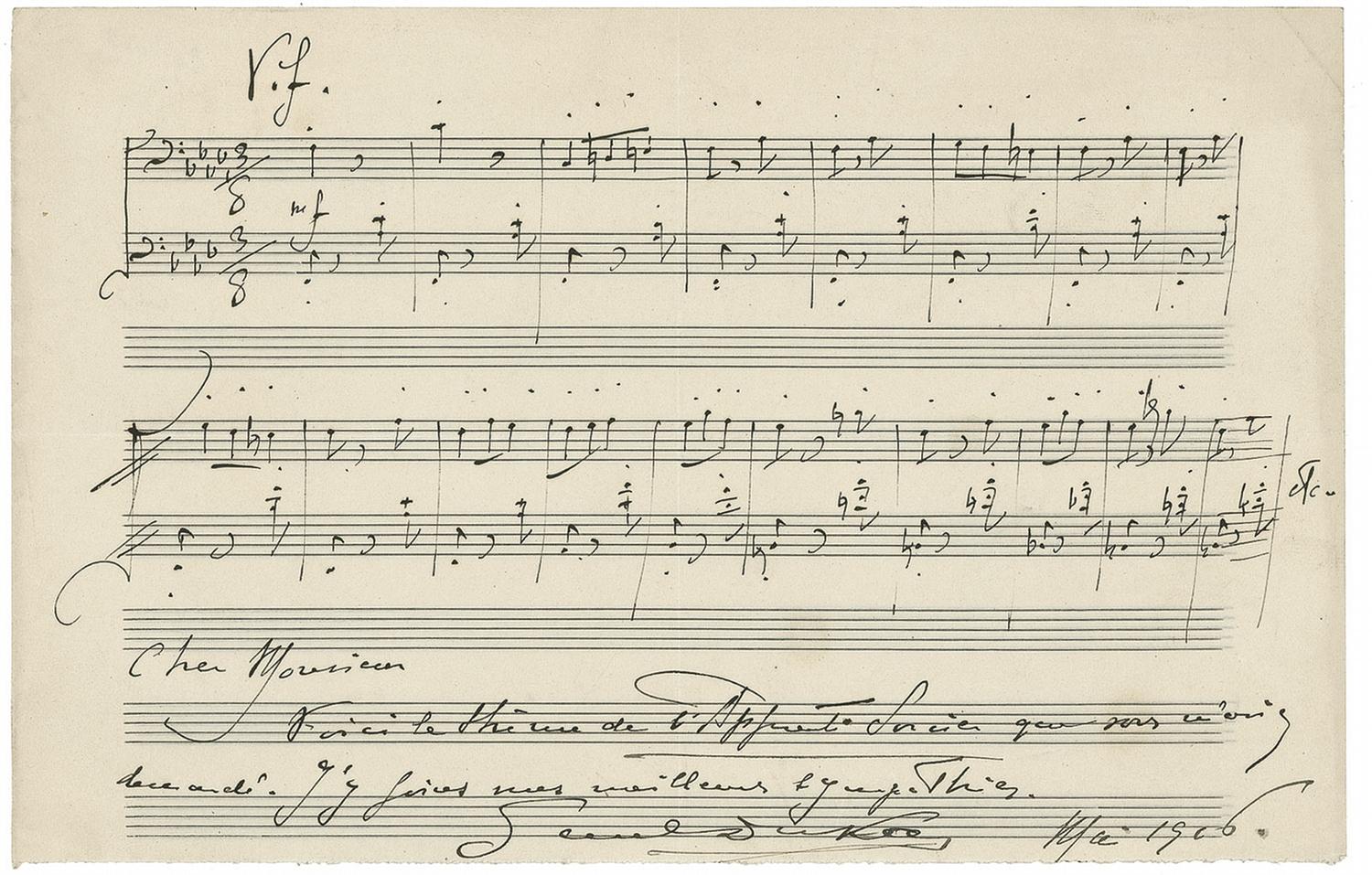 Scarce AMQS of his most popular work, ‘The Sorcerer's Apprentice.’ Dukas pens 18 measures on double staves on a 8.25 x 5.25 off-white sheet, dated May 1916, and inscribed in French. In full (translated): "Dear Sir, Here is the theme of The Sorcerer's Apprentice which you asked for. I send my warmest wishes, Paul Dukas.” In fine condition, with a central vertical and horizontal fold and a rough bottom edge. The measures quoted are among the most well known in all of music, used in countless films, including Walt Disney's Fantasia, with Mickey Mouse as the Sorcerer's Apprentice.