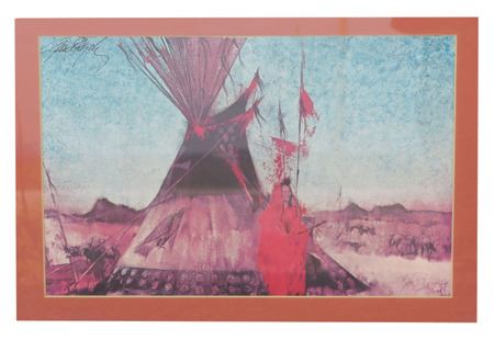 Ca. 1970s, Signed color lithograph depicting a robed subject in front of a Plains tepee. Very good condition. 10-1/2" x 15" (17" x 22" framed)