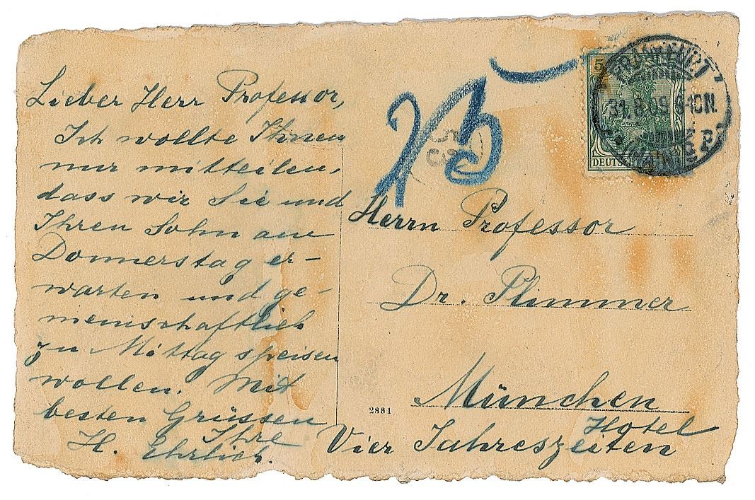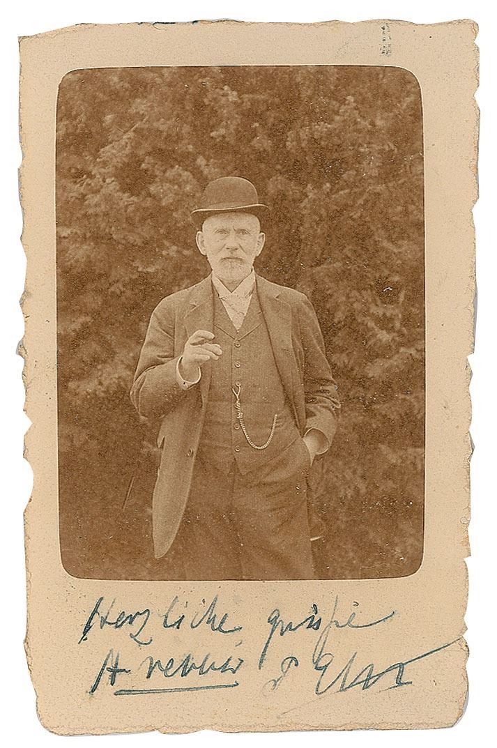 German scientist and pioneer of chemotherapy (1854–1915) who was co-awarded the Nobel Prize for Medicine with Ilya Ilyich Mechnikov in 1908. ALS in German, signed “H. Ehrlich,” one page on a 5.5 x 3.5 portrait postcard, postmarked at Frankfurt, August 31, 1909. Ehrlich sends greetings to the British bacteriologist Henry George Plimmer, signed at the conclusion of the note and below his portrait. In very good to fine condition, with adhesive residue over the letter, and heavy edge wear.