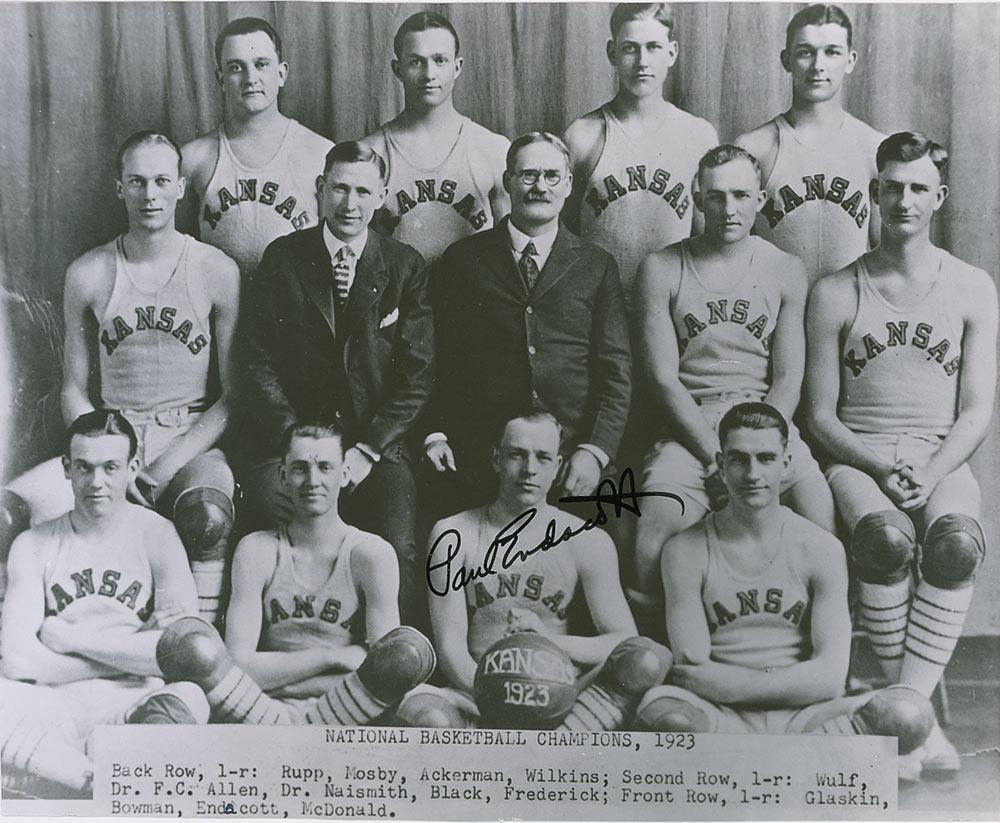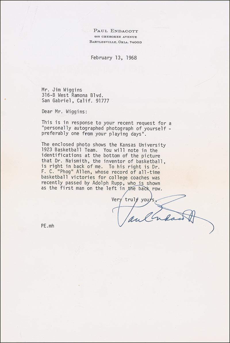 Deceased Basketball Hall of Famer who was a two-time All-Missouri Valley Conference team selection at the University of Kansas. Under Hall of Fame Head Coach “Phog” Allen, Endacott led the team to two national titles and the first ever Missouri Valley Conference undefeated record. Glossy 10 x 8 photo of the 1923 National Champion Kansas University basketball team, signed in black felt tip; and a one page TLS, 7.25 x 10.5, dated February 13, 1968. Endacott references the photo writing: “You will note in the identifications at the bottom of the picture that Dr. Naismith, the inventor of basketball is right behind me.” In fine condition, with a few light surface marks to photo, and a mild block of toning to text of letter.