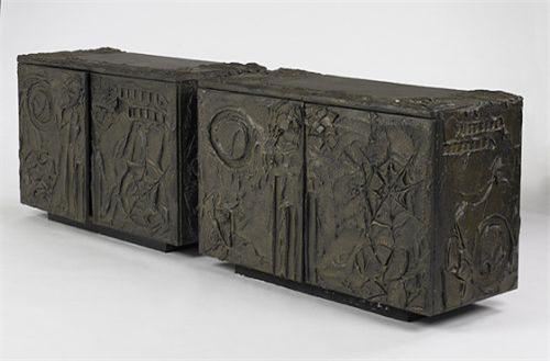 Paul Evans cabinets model PE-38A, pair Paul Evans Studio for Directional USA, 1970 bronzed resin, slate 48.5 w x 21.25 d x 31.25 h inches Incised initials and date to underside: [PE 70]. Two doors conceal one adjustable shelf.