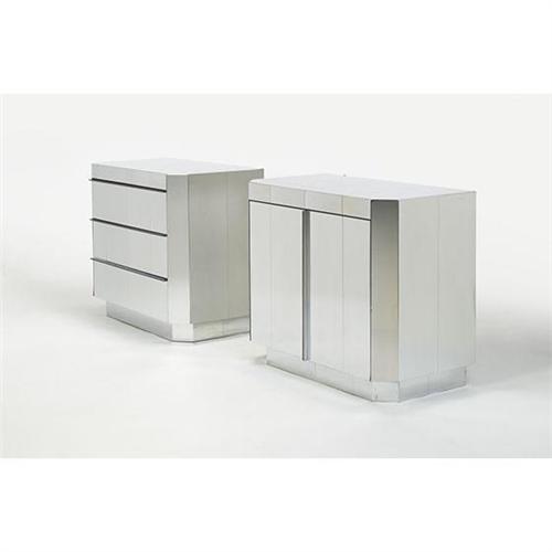 Paul Evans<BR>custom cabinets, pair<BR>Paul Evans Studio for Directional<BR>USA, c. 1975<BR>chrome-plated steel over wood<BR>38 w x 20.5 d x 32.25 h inches<BR>Cabinet features two doors concealing a single adjustable shelf and dresser features three drawers.<BR><BR>Condition of the item is not included in this description. Condition reports are available from Wright upon request. Wright strongly recommends that you review a condition report for each item on which you plan to bid.