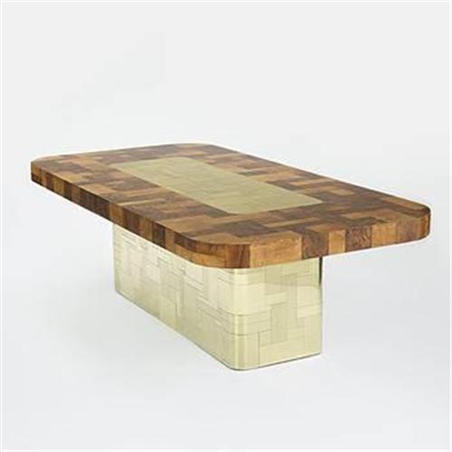 Paul Evans dining table Paul Evans Studio for Directional USA, c. 1970 maple burl, brass 96.5 w x 48 d x 29.5 h inches Sold with two 15 inch leaves; length of table is 126.5 inches when fully extended.