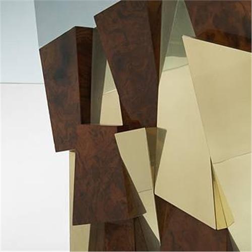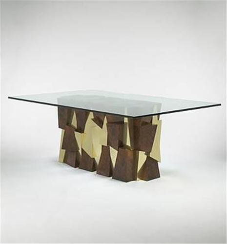 Paul Evans<BR>dining table<BR>Paul Evans Studio for Directional<BR>USA, c. 1970<BR>brass, oak burl, glass<BR>80"w x 48"d x 28.75"h<BR><BR><BR><BR><BR><BR>
