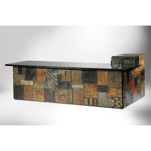 Paul Evans<BR>executive desk<BR>USA, c. 1960<BR>cut and welded steel with applied patina and enamel, slate, gilt and lacquered wood<BR>108 w x 60 d x 37 h inches<BR>Desk features five drawers, multiple letter and file slots, and one telephone mount; return features one pull-out tray, one file drawer and one bi-fold door concealing storage compartment with two adjustable shelves.<BR><BR>Condition of the item is not included in this description. Condition reports are available from Wright upon request. Wright strongly recommends that you review a condition report for each item on which you plan to bid.