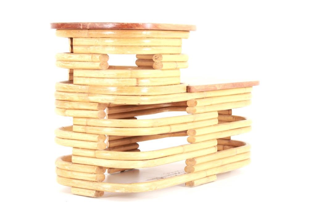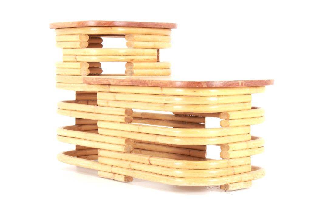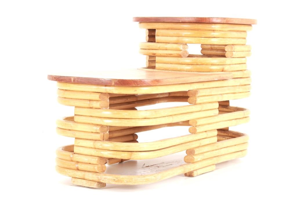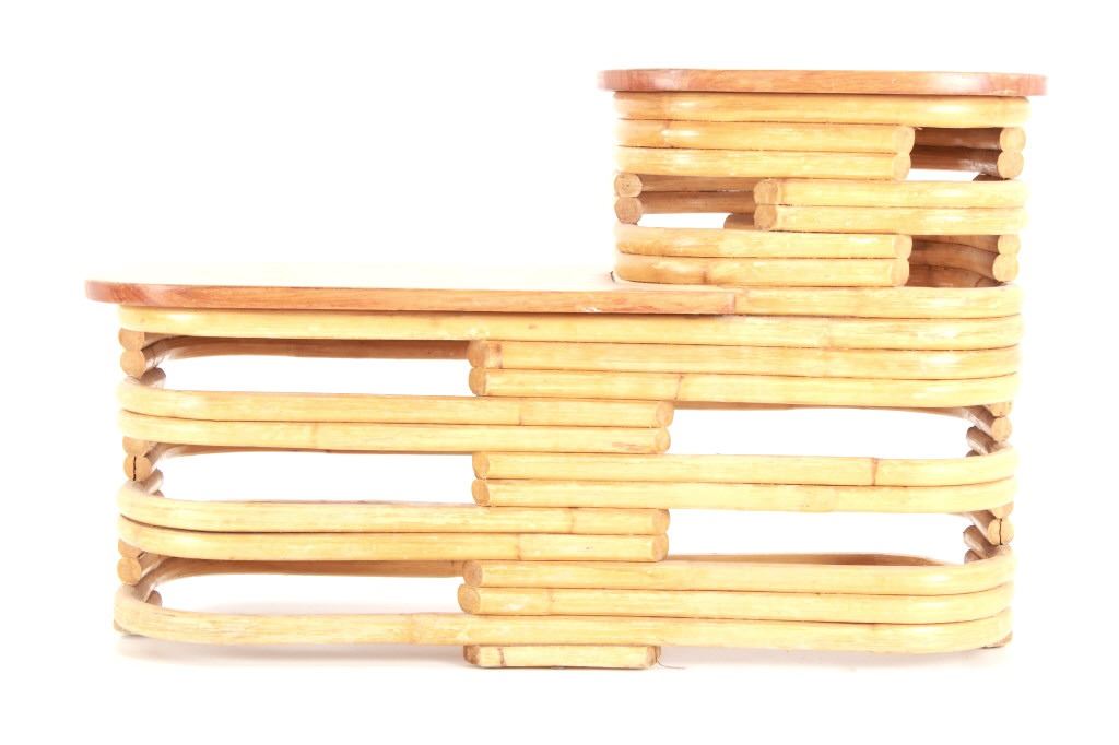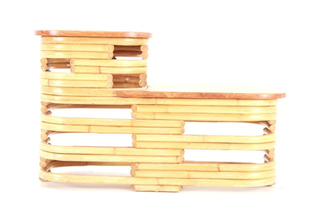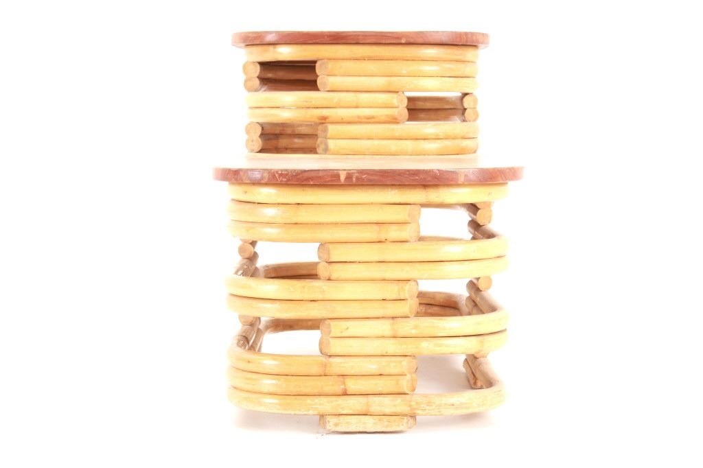 Featured in this lot is an original Paul Frankl Two-Tiered Stacked Rattan Side Table with Mahogany Tops, circa 1930. Vintage rattan end tables by famed designer Paul Frankl. This iconic design draws elements from Art Deco and mid-century modern aesthetics. The gracefully contoured forms are signature Art Deco while the simplicity of design and focus on fine materials are philosophies borrowed from Modernism. The two-tier design features rattan base and Mahogany table tops.