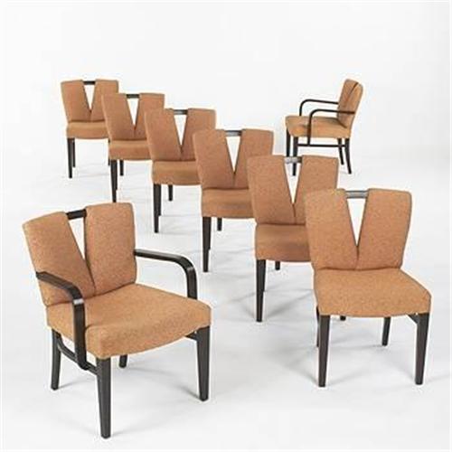 Paul Frankl Y-back dining chairs, set of eight Johnson Furniture Co. USA, c. 1945 mahogany, upholstery 24 w x 23 d x 32.5 h inches side chairs: 24 w x 22 d x 32.5 h