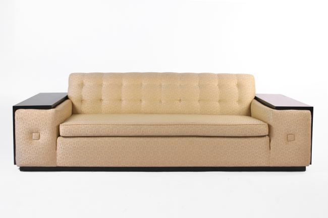 30h x 100w x 35d, black refinished mahogany, original glod/yellow fabric, original very good condition