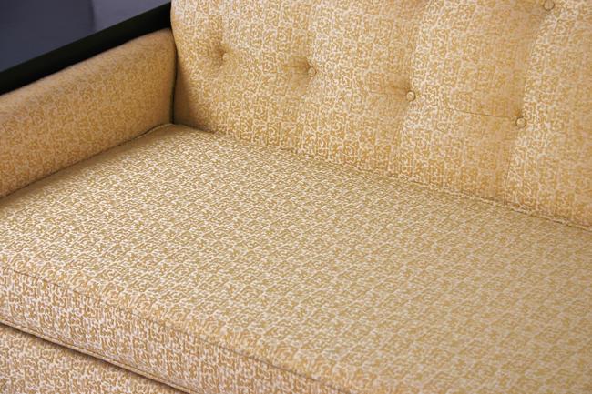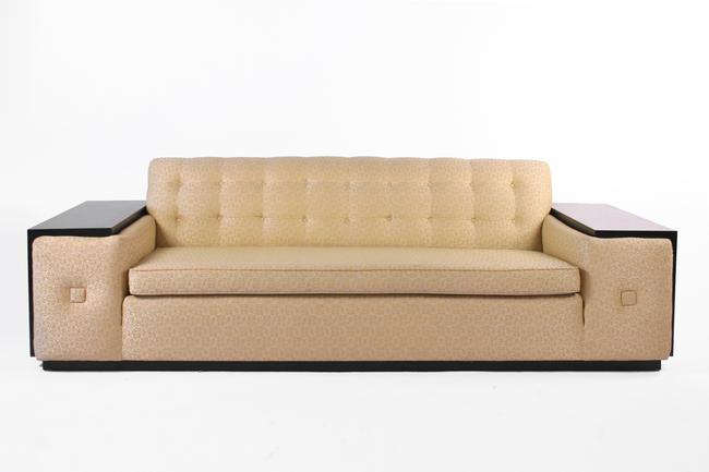 30h x 100w x 35d inches, black refinished mahogany, original gold/yellow fabric