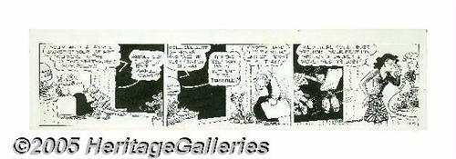 <B>Paul Fung Jr. - Polly and Her Pals Daily Comic Strip Original Art, dated 11-5-40 (King Features Syndicate, 1940).</B></I> Paul Fung Jr. captured the art deco style of Cliff Sterrett's way-out sight gags perfectly for the <I>Polly and Her Pals</B></I> dalies. This side-splitter features appearances by Polly, Paw, and Kitty. The image area of the strip is 25" x 5.5", and the art is in Excellent condition. <I>From the collection of Gill Fox</B></I>.