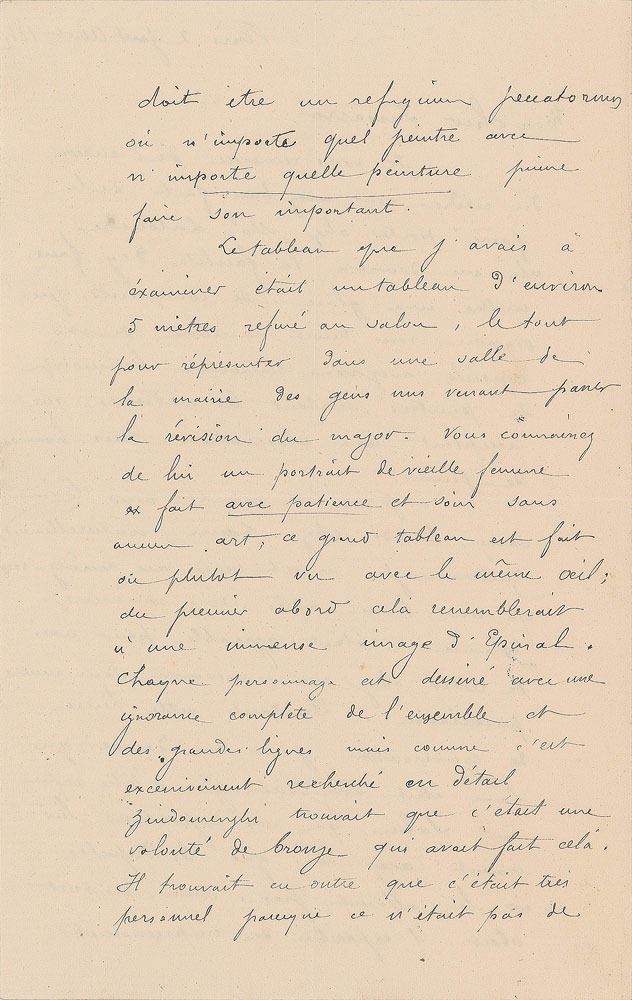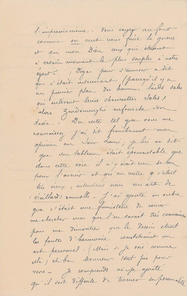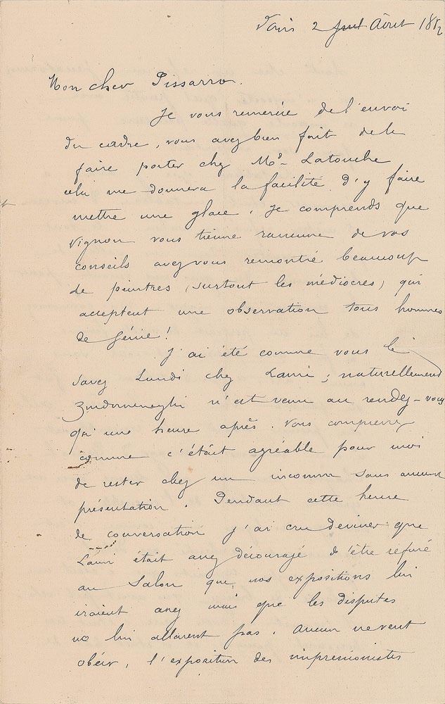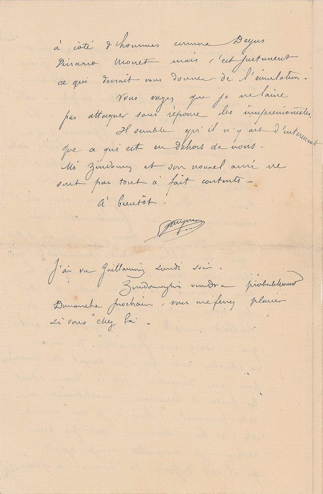 Besides, as you know me, I expressed my opinion frankly to Lami. I told him that his painting was appalling, that in this way there was nothing good for the future, and that, moreover, it was very old, an old and softened art. I added further that it was a mockery to come and fetch me, as everyone knew I am very convinced that the narrow design, the harmony faults were a personal art. But if I see it like this, well, sir, too bad for you—I understand it is difficult to find personality alongside men like Degas, Pissarro, Monet, but this is precisely what should give you emulation. You see that I do not allow the Impressionists to be attacked without a reply. It seems that there are interesting things just outside of us. Mr. Zandomeneghi and his new friend are not quite happy." He adds a brief postscript, "I saw Guillaumin on Monday night. Zandomeneghi will probably come next Sunday, you would make me happy if you were there." In fine condition.