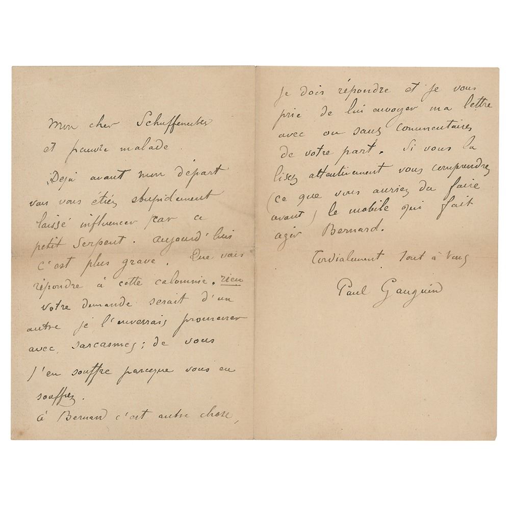 ALS in French, two pages on two adjoining sheets, 4.5 x 6.75, no date but postmarked April 30, 1895. Handwritten letter to painter, art teacher, and collector Emile Schuffenecker, berating him for having listened to the "slander" of "the little snake," presumably referring to Gauguin's estranged wife Mette-Sophie Gad. He also makes reference to his "departure," most likely his final departure from France for Tahiti, which would occur two months later in June 1895. In full (translated): "My dear Schuffenecker and poor invalid, Already before my departure you were stupidly letting yourself be influenced by the little snake. Today it is more serious. What will I respond to this slander? Nothing. Your request coming from any other person, I would send you to hell with sarcasms; from you, I suffer from it because it makes you suffer. As for Bernard, that is another thing. I must respond and I pray that you send him my letter, with or without commentary from you. If you read it closely you will understand (what you should have done before) the motive prompting Bernard to act as he did." In fine condition. Accompanied by the original mailing envelope, addressed in Gauguin's hand.