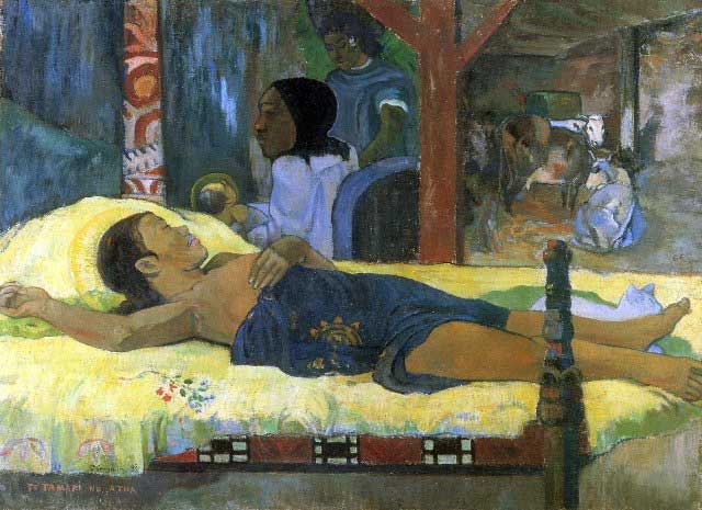 Artist: Paul Gauguin - Title: Birth of Christ Son of God Tetemari - Medium: Fine Art Reproduction Giclee on Canvas - Image Size: Approximately 14.5 inches x 20 inches - Unframed on Unstretched Canvas - Biography: French post-impressionist artist Paul Gauguin was an important figure in the Symbolist art movement of the early 1900's. His use of bold colors, exaggerated body proportions and stark contrasts in his paintings set him apart from his contemporaries, helping pave the way for the Primitivism art movement. Gauguin often sought exotic environments and spent time living and painting in Tahiti.
