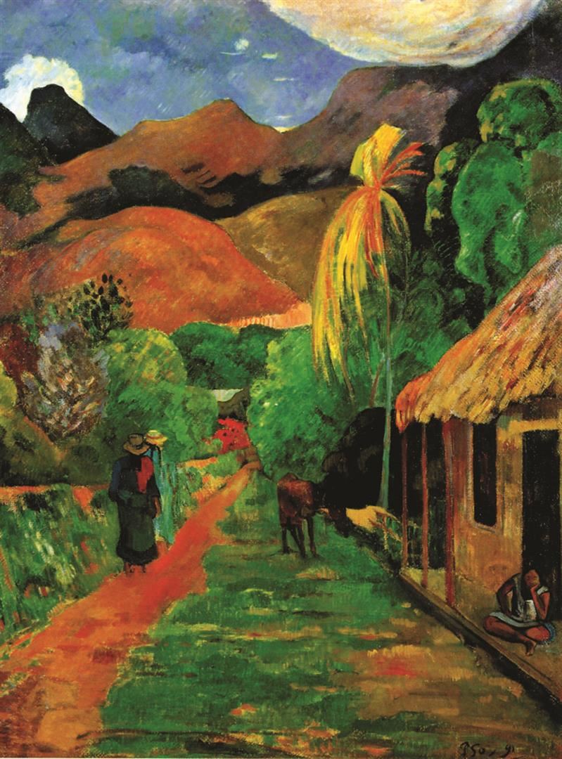 Artist: Paul Gauguin  - Title: Chemin A Pepeete  - Medium: Fine Art Giclee on Canvas - Image Size: Approximately 32inches x 23.5 inches - Framed: Unframed on Unstretched Canvas - French artist Paul Gauguin's bold colors, exaggerated body proportions and stark contrasts helped him achieve broad success in the late 19th century.