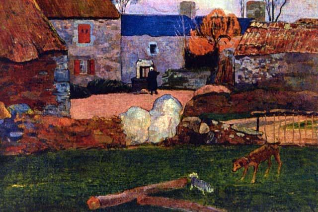 Artist: Paul Gauguin - Title: Farm at the Pouldu - Medium: Fine Art Reproduction Giclee on Canvas - Image Size: Approximately 13.25 inches x 20 inches - Unframed on Unstretched Canvas - Biography: French post-impressionist artist Paul Gauguin was an important figure in the Symbolist art movement of the early 1900's. His use of bold colors, exaggerated body proportions and stark contrasts in his paintings set him apart from his contemporaries, helping pave the way for the Primitivism art movement. Gauguin often sought exotic environments and spent time living and painting in Tahiti.