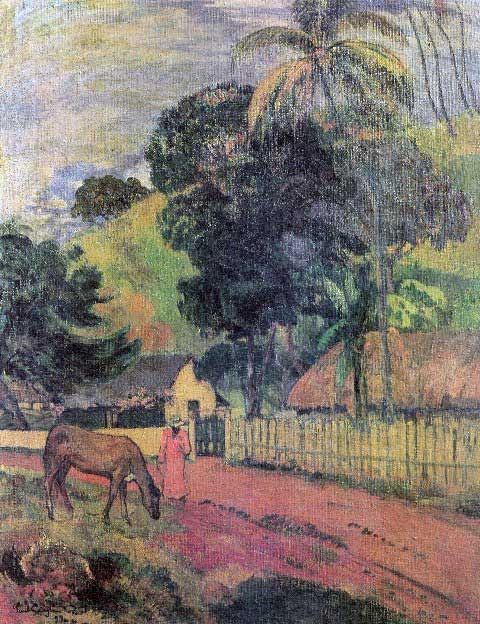 Artist: Paul Gauguin - Title: Landscape - Medium: Fine Art Reproduction Giclee on Canvas - Image Size: Approximately 20 inches x 15.25 inches - Unframed on Unstretched Canvas - Biography: French post-impressionist artist Paul Gauguin was an important figure in the Symbolist art movement of the early 1900's. His use of bold colors, exaggerated body proportions and stark contrasts in his paintings set him apart from his contemporaries, helping pave the way for the Primitivism art movement. Gauguin often sought exotic environments and spent time living and painting in Tahiti.