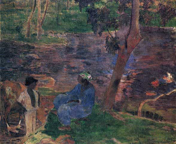 Artist: Paul Gauguin - Title: Pond Shore - Medium: Fine Art Reproduction Giclee on Canvas - Image Size: Approximately 16.25 inches x 20 inches - Unframed on Unstretched Canvas - Biography: French post-impressionist artist Paul Gauguin was an important figure in the Symbolist art movement of the early 1900's. His use of bold colors, exaggerated body proportions and stark contrasts in his paintings set him apart from his contemporaries, helping pave the way for the Primitivism art movement. Gauguin often sought exotic environments and spent time living and painting in Tahiti.