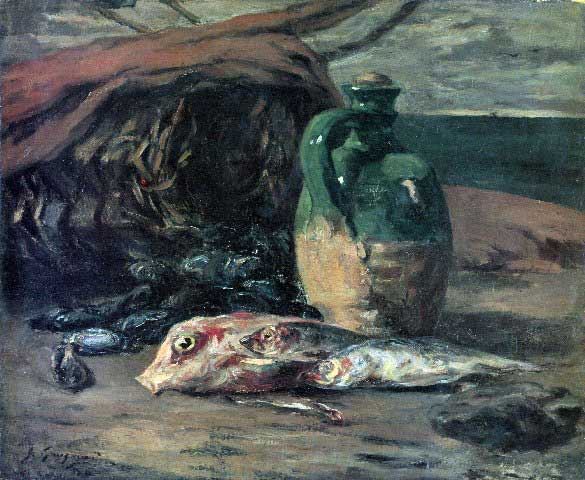 Artist: Paul Gauguin - Title: Still Life with Fish - Medium: Fine Art Reproduction Giclee on Canvas - Image Size: Approximately 16.5 inches x 20 inches - Unframed on Unstretched Canvas - Biography: French post-impressionist artist Paul Gauguin was an important figure in the Symbolist art movement of the early 1900's. His use of bold colors, exaggerated body proportions and stark contrasts in his paintings set him apart from his contemporaries, helping pave the way for the Primitivism art movement. Gauguin often sought exotic environments and spent time living and painting in Tahiti.