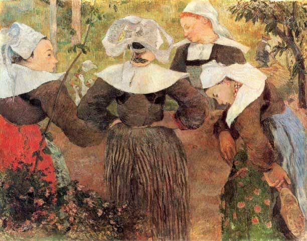 Artist: Paul Gauguin - Title: The Dance of 4 Women of Breton - Medium: Fine Art Reproduction Giclee on Canvas - Image Size: Approximately 15.5 inches x 20 inches - Unframed on Unstretched Canvas - Biography: French post-impressionist artist Paul Gauguin was an important figure in the Symbolist art movement of the early 1900's. His use of bold colors, exaggerated body proportions and stark contrasts in his paintings set him apart from his contemporaries, helping pave the way for the Primitivism art movement. Gauguin often sought exotic environments and spent time living and painting in Tahiti.
