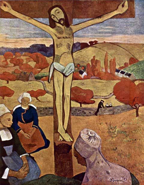 Artist: Paul Gauguin - Title: Yellow Christ - Medium: Fine Art Reproduction Giclee on Canvas - Image Size: Approximately 20 inches x 15.5 inches - Unframed on Unstretched Canvas - Biography: French post-impressionist artist Paul Gauguin was an important figure in the Symbolist art movement of the early 1900's. His use of bold colors, exaggerated body proportions and stark contrasts in his paintings set him apart from his contemporaries, helping pave the way for the Primitivism art movement. Gauguin often sought exotic environments and spent time living and painting in Tahiti.