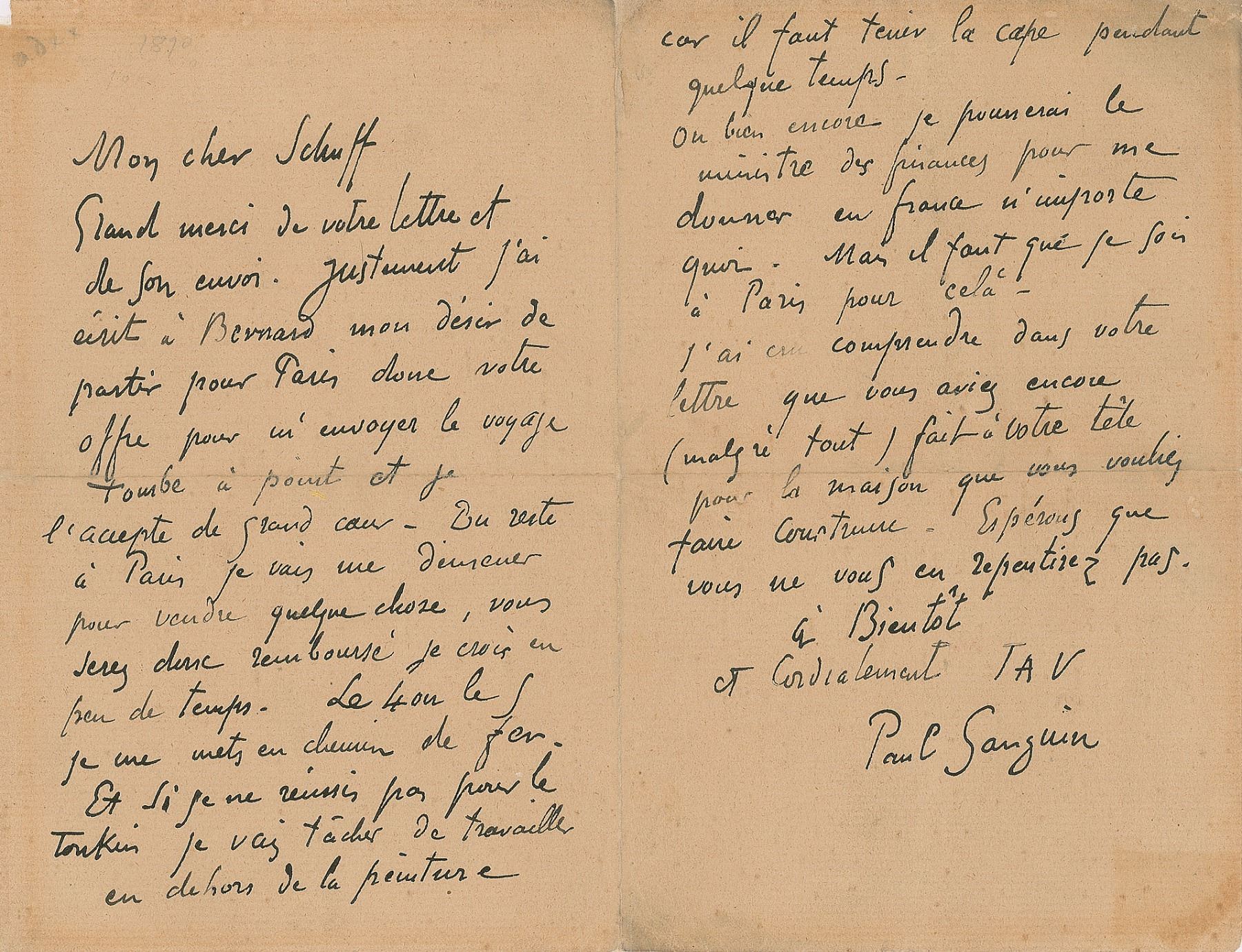 Important French post-Impressionist painter (1848–1903) recognized for his experimental use of color and synthetist style. In 1891, he traveled to Tahiti, where the brilliant hues and primitive sculpture closely complemented his own art, which was marked by strong colors, few lines, and flat patterns. Supremely desirable ALS in French, two pages on two adjoining sheets, 4.5 x 7, no date. Letter to Emile Schuffenecker, thanking him for arranging for Gauguin to travel to Paris by train. In part (translated): "Thank you very much for your letter and for sending it. I just wrote Bernard about my desire to leave for Paris; thus, your offer to send me on the trip comes just at the right time and I happily accept it. Moreover, I will organize to sell something in Paris, and therefore you will be reimbursed within short time, I believe. On the 4 or the 5 I will take the train. And if I don't make it to Tonkin I will try to work outside of painting for some time because it’s necessary to hold course. Or I will rather push the minister of finance to give me something in France. But I would have to be in Paris for that." Completely silked on the reverse and in very good to fine condition, with light foxing, toning, and a few small areas of repaired paper loss to edges.