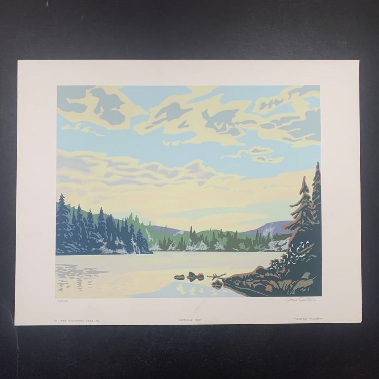 Paul Gauthier's "Morning Mist" limited edition print, signed lower right, and numbered 110/250 lower left. This piece is of a view of the sky with clouds, and a body of water and some trees in the distance. This piece is in great condition, but does have a dirt stain lower middle.