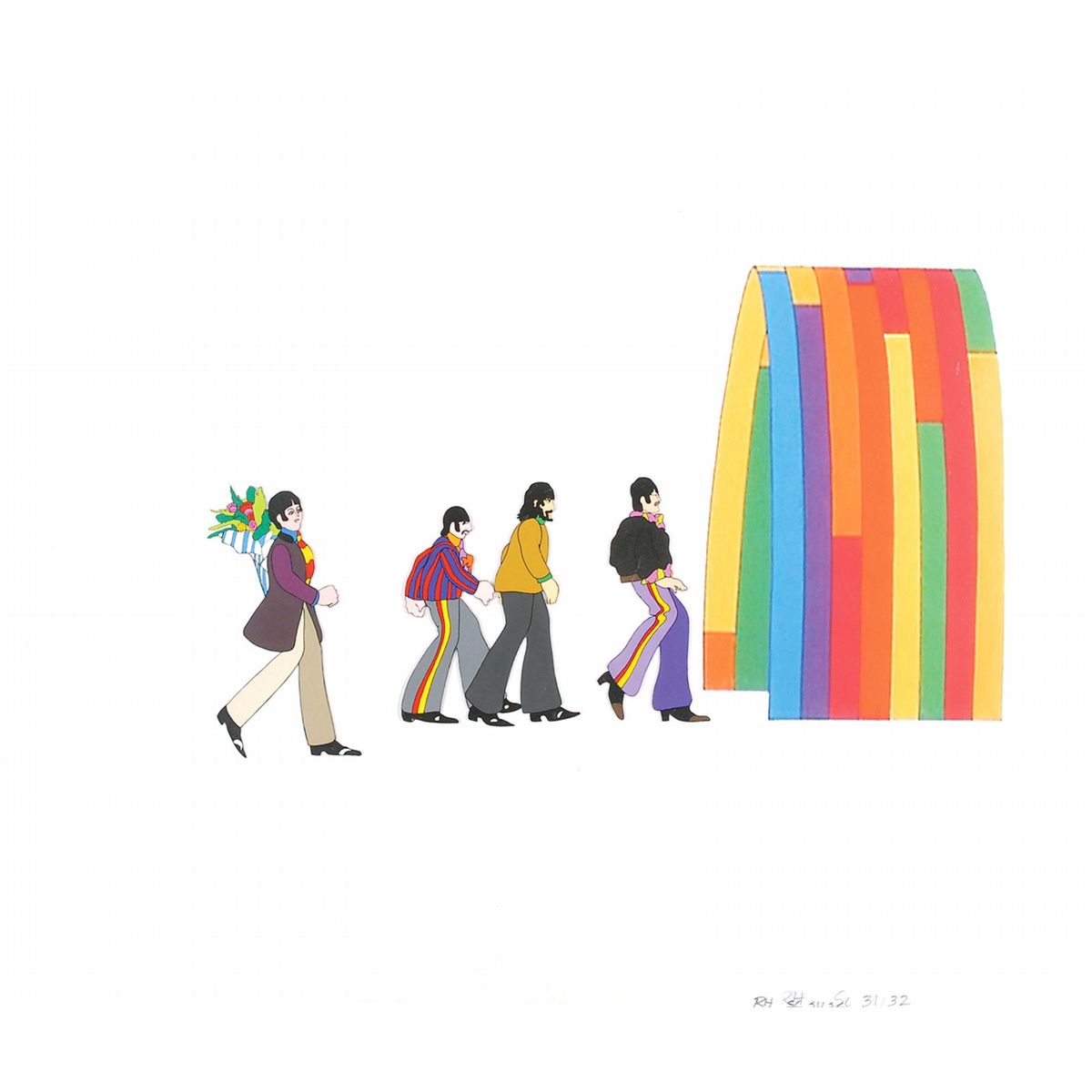 (United Artists/King Features, 1968) Original production cel featuring Paul, George, Ringo, and John from Yellow Submarine. The cel is placed on a laser copy background. All four images of the band walking towards a rainbow measure approximately 1.25 x 3.75, with overall dimensions of 17 x 13. In fine condition. Cels from the film featuring all four Beatles are quite uncommon and desirable, as they are not often seen on screen together.