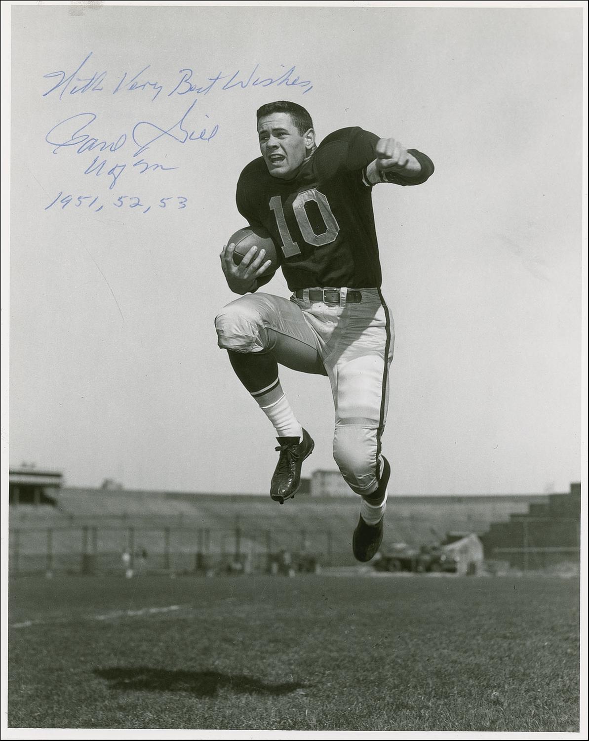College Football Hall of Famer (1932-2002) who was the star quarterback at the University of Minnesota. Glossy 8 x 10 photo of Giel leaping through the air, signed in blue ballpoint, “With very best wishes, Paul Giel, U. of M., 1951, 52, 53.” In very fine condition.