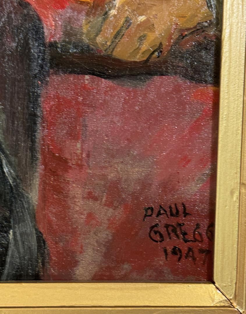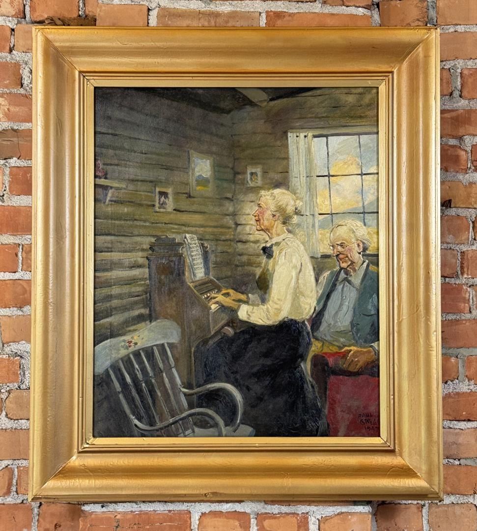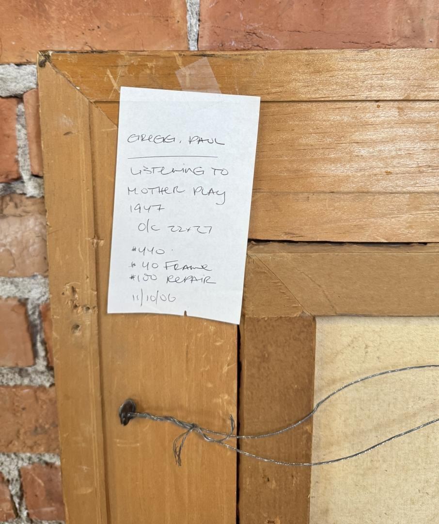 Title is Listening to Mother Play. Oil on Canvas. 22" by 27" unframed. 30 1/2" by 35 1/2" framed. Paul Gregg (1876 - 1949) was active/lived in Colorado, Kansas. Paul Gregg is known for Historical-narrative, illustrator. Born Baxter Springs, 1876; died Denver, CO, July 9, 1949. Illustrator. Painter, specialized in western scenes. Left Kansas at age 17 to spend a year at the St. Louis Museum of Fine Art. Worked for the St. Louis Republic. Returned to Baxter Springs each summer to sketch. Joined the Denver Post staff as an illustrator in 1902.