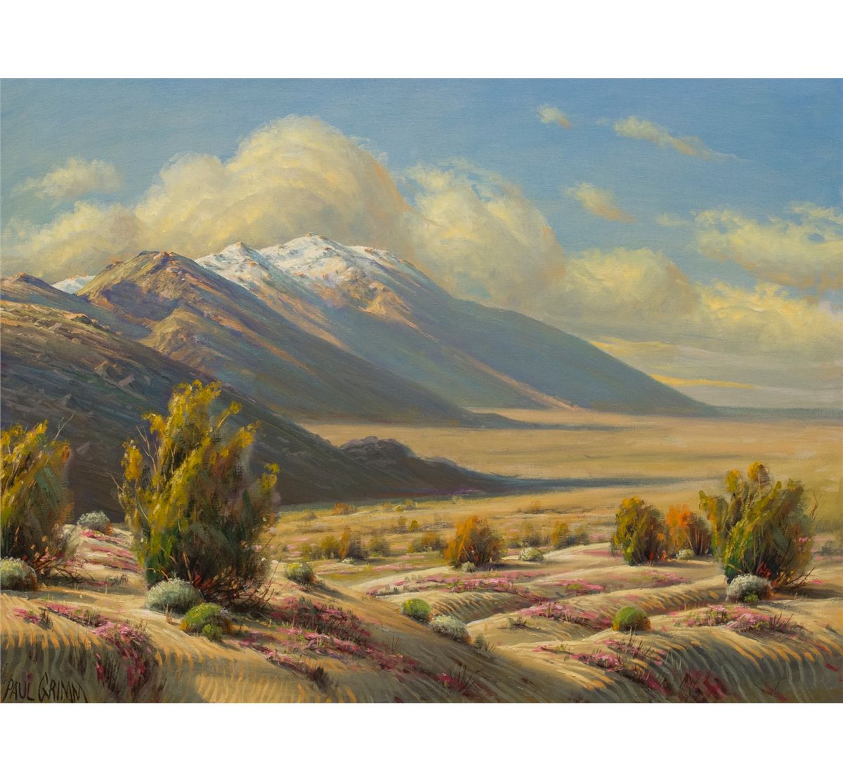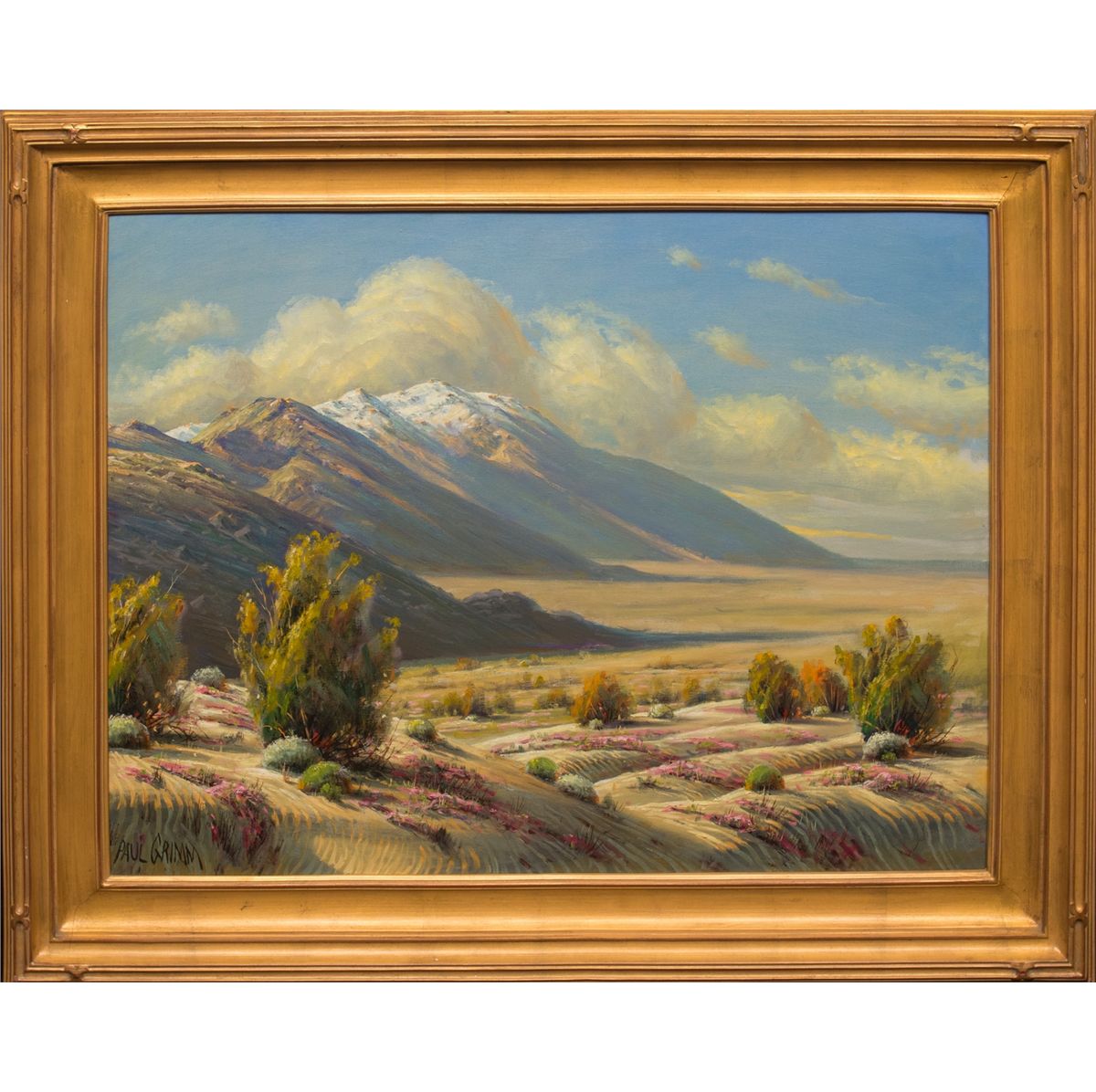 Paul Grimm (1891 - 1974). Desert Flower Show 'Neath Mt. San Jacinto. 30" x 40" oil on canvas. Signed lower left: PAUL GRIMM. Verso: Titled, dated Jan 70 and signed.