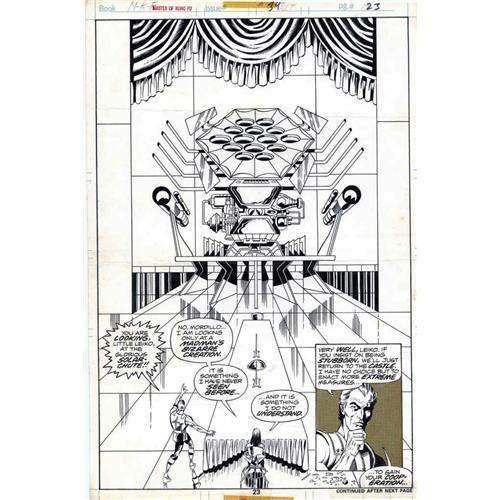<B>Paul Gulacy and Dan Adkins - Master of Kung Fu #34, Splash page 23 Original Art (Marvel, 1975).</B></I> Mordillo is insane, there's no doubt about it. But he's also a master of robotics, and assasination, and possessed with great creative genius. Who else could have invented the glorious Solar Chute, a sub-orbital ship which has the power to focus solar energy into a devastating weapon? Mordillo takes a moment to gloat, while Shang-Chi's lover, Leiko, looks on in this page from the Doug Moench story, "Cyclone At the Center of a Madman's Crown". The art has an image area of 10" x 15", and, aside from some light aging, and a tape stain at the top and bottom center edges, the condition is Very Good.