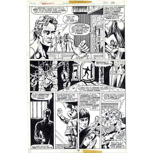 <B>Paul Gulacy and Dan Adkins - Master of Kung Fu #35, page 10 Original Art (Marvel, 1975).</B></I> Though fragile, and without much fighting prowess, the robot, Brynocki, is intensely loyal to his creator, the lunatic assassin, Mordillo. Following orders, Brynocki prepares the devastatingly deadly Solar Tube for immediate transport, in this page from the Doug Moench story, "Death Hand and the Sun of Mordillo," which was penciled by Paul Gulacy and inked by Dan Adkins. The art has an image area of 10" x 15", and, aside from a tape stain at the top and bottom center edges, the condition is Excellent.