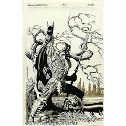 <B>Paul Gulacy and Terry Austin - Batman vs. Predator II: Bloodmatch #2 Original Art Cover (DC, 1995).</B></I> The Predator claims victory, and Batman's cowl, as the Caped Crusader lies supine on the ground. Terry Austin's inks are the perfect complement to Paul Gulacy's detailed pencils. The tonal effects were created using Craft Tint board. This cover will make a superb wall trophy, art hunters! <BR><BR><B>Important notice:</B> Heritage usually auctions material at the rate of 200-250 lots per hour. On some occasions eBay Live bid software or the Internet may not be able to keep up with the pace of the auction. We recommend placing a realistic absentee bid now as insurance to avoid disappointment. Occasionally the auctioneer may eliminate or reject an eBay Live bid, and the auctioneer may also reopen a lot after the close of the eBay live bidding (usually because we missed an audience bid), and may reject your bid even if it shows you as the winning bidder. By bidding via eBay Live, you agree that Heritage may award the lot to another bidder at its sole discretion under the circumstances described above or any other reasonable circumstances. Since eBay bids are not shown to us until we open the lot on the floor, we treat those bids just like floor bids. In most cases the floor responds before the eBay bid is presented to us, due to Internet lag time, so for consistency we have made it a policy that floor bids are always considered first over tie eBay live bids. Also please note that all Heritage lots purchased through eBay Live carry a 20% Buyer's Premium. Please make sure you read the Terms and Conditions before you bid.