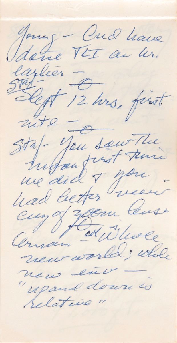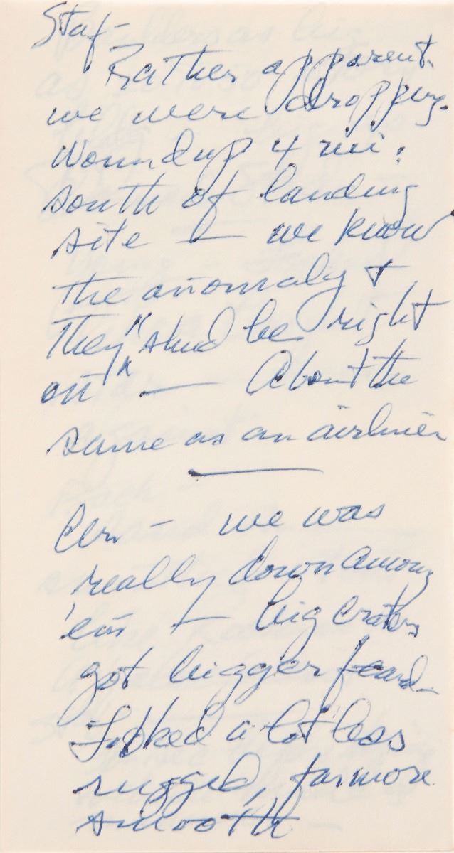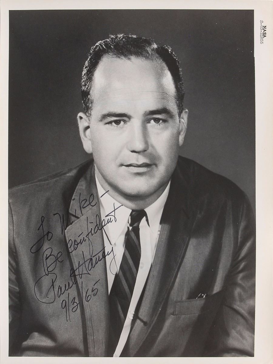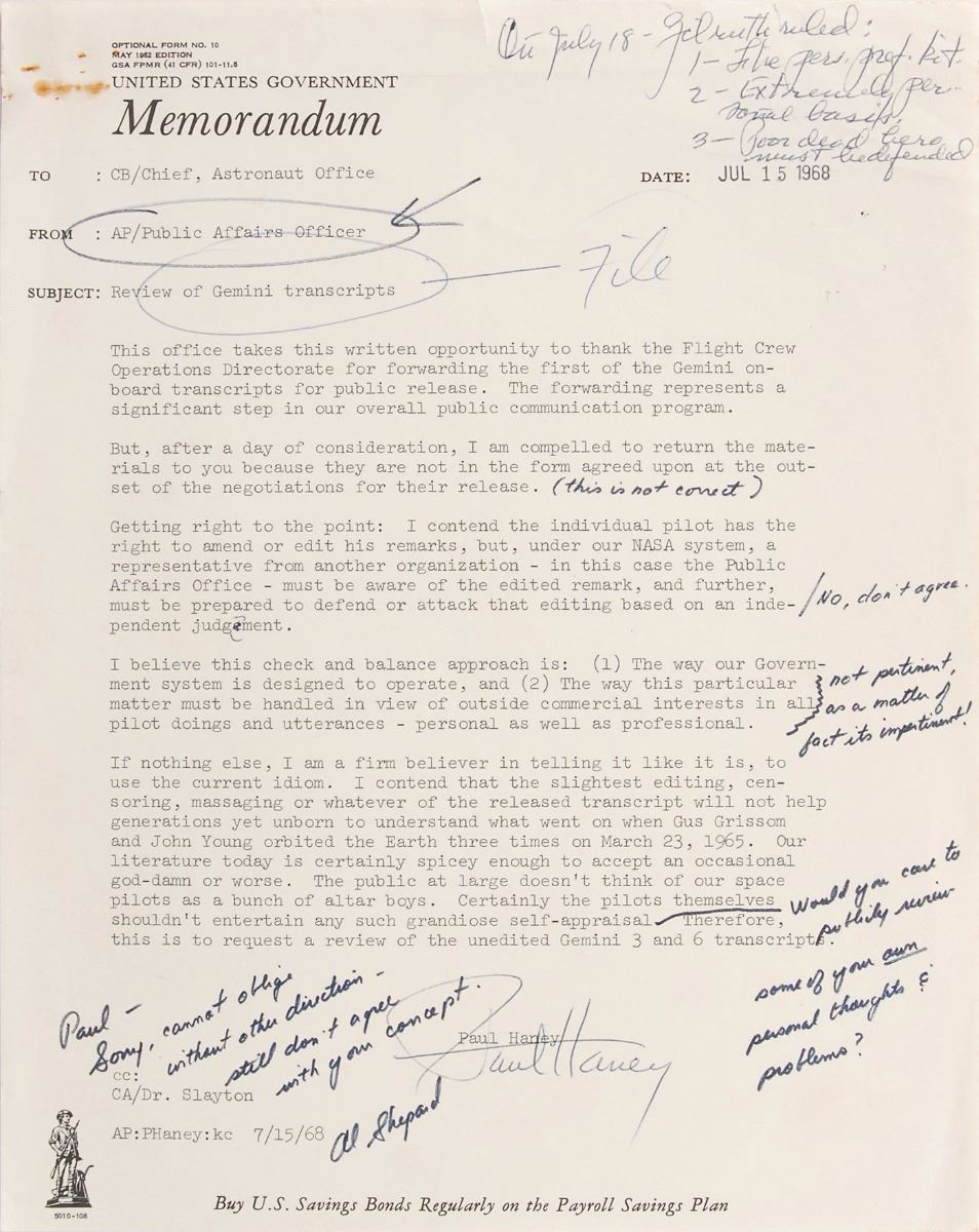 Three items related to Paul Haney, the MSC public affairs officer who famously delivered the live mission control commentary during the Gemini and Apollo space flights, including: an official glossy 8 x 10 NASA portrait photo of Haney in a suit and tie, signed and inscribed in black felt tip, “To Mike—Be confident, Paul Haney, 9/3/65”; a small reporter’s notebook, 3 x 6.25, used during the Apollo 10 press conference by Haney, who has added “Apollo 10 Crew Conf” to the front cover, and has filled out the first twelve pages in his own hand with various notes from the conference, including wonderful astronauts descriptions of the moon and LMP Gene Cernan’s remarks on cursing during the broadcast: “Staf—You saw the moon first time, we did & you had better view cuz of zoom lens, Cernan—A whole new world; whole new env.—’up and down is relative’…Staf—Rather apparent we were dropping. Wound up 4 mi. south of landing site—we know the anomaly & they ‘should be right on’—about the same as an airliner, Cern—We was really down among’em—big crates got bigger fast, looked a lot less rugged, far more smooth, Boulders as big as 20 to 50 story bldg—big as Domed Stad.—Young—Looked like a bright star…Cernan—Left moon like a scalded ape, like a high-speed elevator…Young—Maybe that moon was alive once. I don’t rule it out. With brown color, there is a suggestion of oxidation. Pretty exciting place—…Cernan—Totally unrehearsed—What you heard was 3 men doing a job—’Sorry if we offended’”; and a United States Government Memorandum letter from Haney to Chief of the Astronaut Office Alan Shepard, in part: “This office takes this written opportunity to thank the Flight Crew Operations Directorate for forwarding the first of the Gemini onboard transcripts for public release. The forwarding represents a significant step in our overall public communication program. But, after a day of consideration, I am compelled to return the materials to you because they are not in the form agreed upon at the outset of the negotiations for their release…I am a firm believer in telling it like it is, to use the current idiom. I contend that the slightest editing, censoring, massaging or whatever of the released transcript will not help generations yet unborn to understand what went on when Gus Grissom and John Young orbited the Earth three times on March 23, 1965. Our literature today is certainly spicey enough to accept an occasional god-damn or worse.” Haney signs at the conclusion and adds notes to the upper right in black ballpoint. Additionally, Shepard has added several handwritten notes of argumentation in black felt tip to the text, and pens a short note in the lower left corner, “Paul—Sorry, cannot oblige without other direction—still don’t agree with your concept. Al Shepard.” In overall fine condition. With content featured in the 2014 book Marketing the Moon, this is a truly unique and insightful grouping from early on in the Apollo program that details seldom-seen astronaut accounts and Haney’s push for an open-program mandate of unedited NASA transcripts. Pre-certified Zarelli Space Authentication.